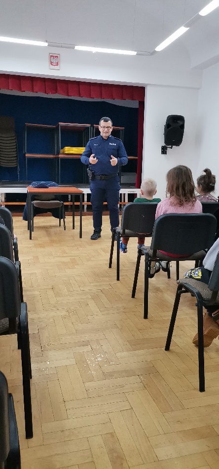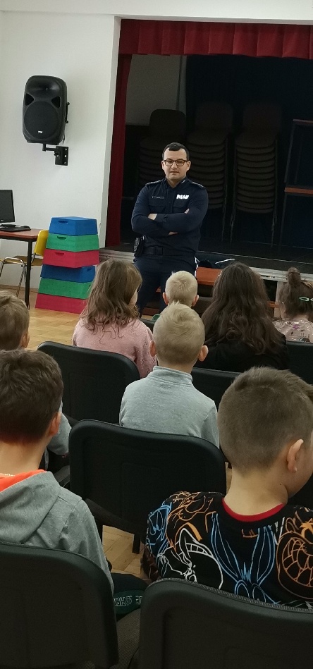 W dniu 23 stycznia gościliśmy w naszej szkole pana policjanta, który przeprowadził pogadankę z uczniami i przedszkolakami na temat bezpieczeństwa podczas ferii zimowych. Ostatnie dni nie poskąpiły nam opadów śniegu, więc zanosi się na to, iż wraz z feriami zbliża się do nas wielkimi krokami również białe szaleństwo. Z tego też względu pan policjant przypomniał o najważniejszych zasadach bezpieczeństwa związanych z zabawami na śniegu, z jazdą na sankach, nartach i łyżwach. Wprawdzie większość dzieciaków o tym wszystkim pamięta, ale ostrożności nigdy za wiele.