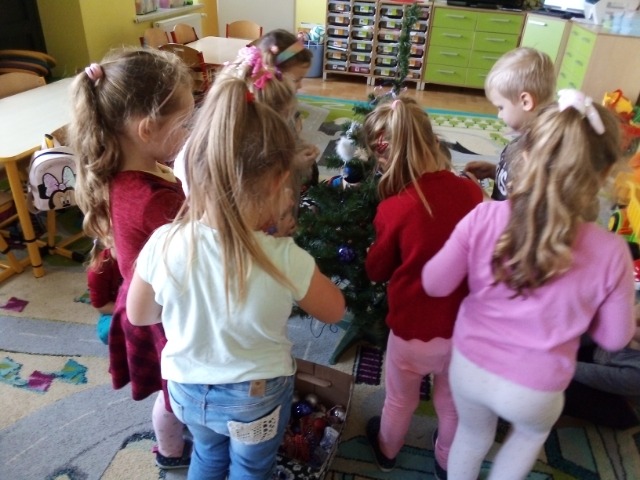 Przedświąteczny czas wiąże się z tradycją ubierania świątecznego drzewka. W naszym przedszkolu również nie mogło zabraknąć tego rytuału. Zanim jednak przystąpiliśmy do dekorowania choinki, dzieci obejrzały „LEGENDĘ O CHOINCE”, z której dowiedziały się: skąd wzięła się choinka i czego jest symbolem.