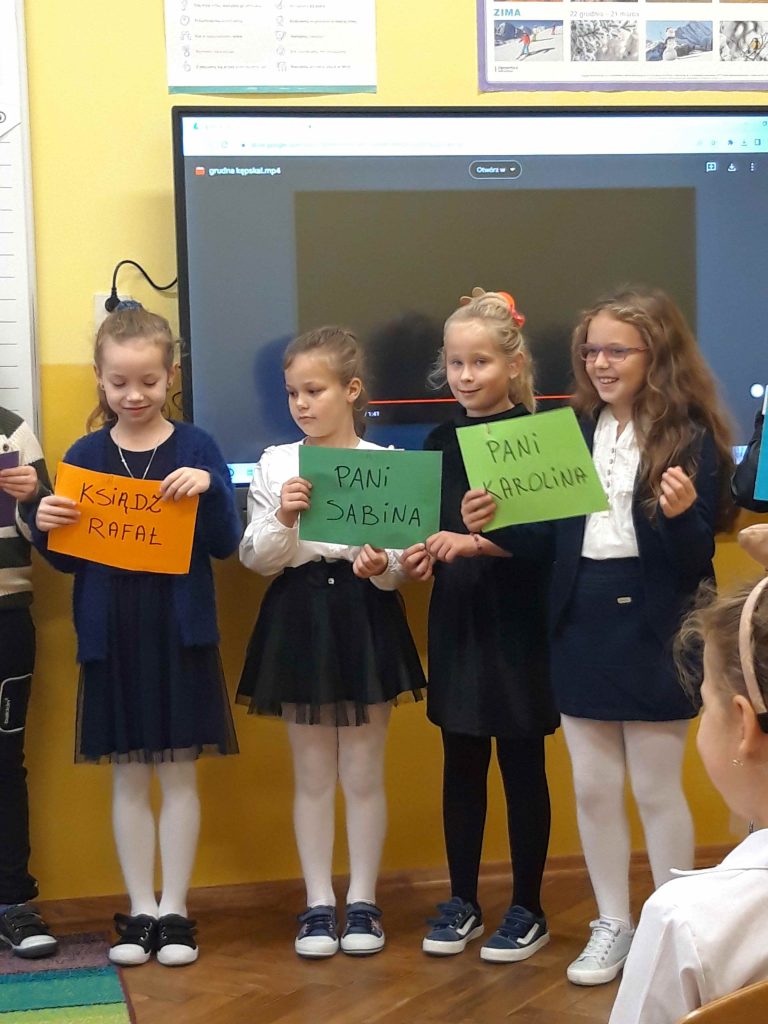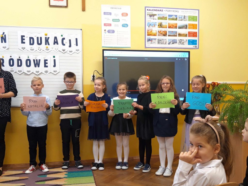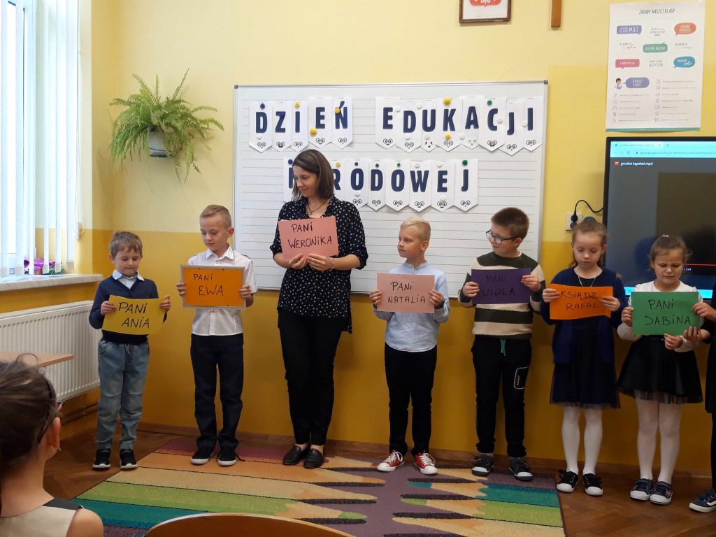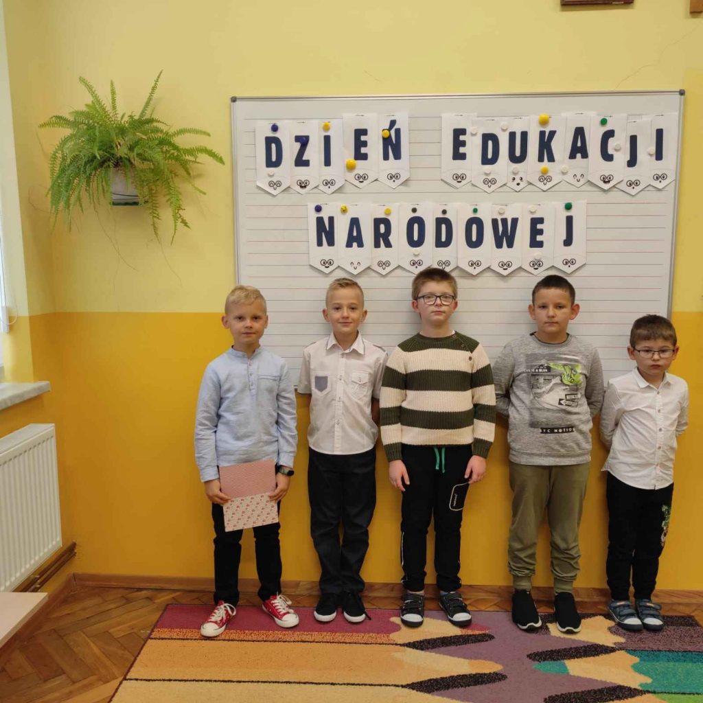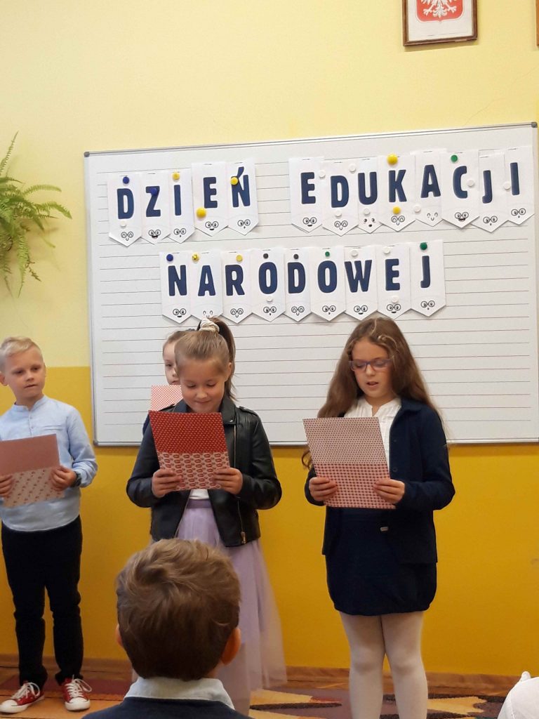 13 października w naszej szkole odbyła się uroczystość z okazji Dnia Edukacji Narodowej. Uczniowie należący do samorządu uczniowskiego recytowali wiersze o nauczycielach, a pozostali uczniowie wygłosili życzenia płynące prosto z serca. Występy uświetniła prezentacja zabawnego filmu przygotowanego przez uczniów z wykorzystaniem sprzętu zakupionego w ramach projektu Laboratoria Przyszłości. Podczas filmu mogliśmy zobaczyć przewodniczącego szkoły w roli reportera, pytającego przechodniów (pozostałych uczniów) czego życzyliby w danym dniu swoim nauczycielom. Na zakończenie przedstawienia uczniowie wręczyli wychowawcom, nauczycielom i innym pracownikom szkoły samodzielnie wykonane laurki oraz kwiaty, a nauczyciele poczęstowali dzieci słodkościami. Następnie każda klasa udała się wraz z wychowawcami do swojej sali, by wspólnie świętować ten uroczysty dzień.