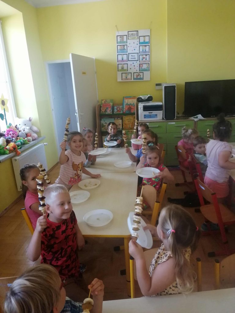 „Jabłka jemy przez rok cały, czy są mrozy czy upały. Nieraz trafią do szarlotki, albo będzie z nich kompot słodki”. Jabłka mają wiele witamin, są bardzo zdrowe i dobrze wpływają na gardło – takich informacji dowiedziały się dzieci dnia 28 września w naszym oddziale przedszkolnym, gdyż obchodziliśmy Dzień Jabłka. Cześć zajęć była poświęcona właśnie temu owocu. Były gry i zabawy, ale także układanie rytmu z owoców w formie szaszłyka, który następnie przedszkolaki zjadły ze smakiem. Każdy w tym dniu otrzymał smaczne jabłuszko i zabrał je do domu.