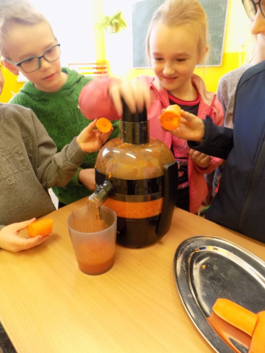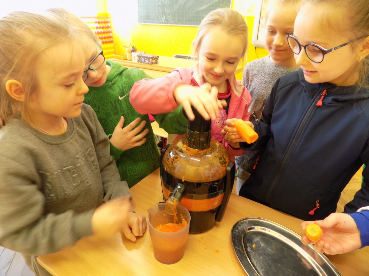 Uczniowie klas II i III samodzielnie przygotowali sok marchewkowy, którym częstowali wszystkie dzieci.