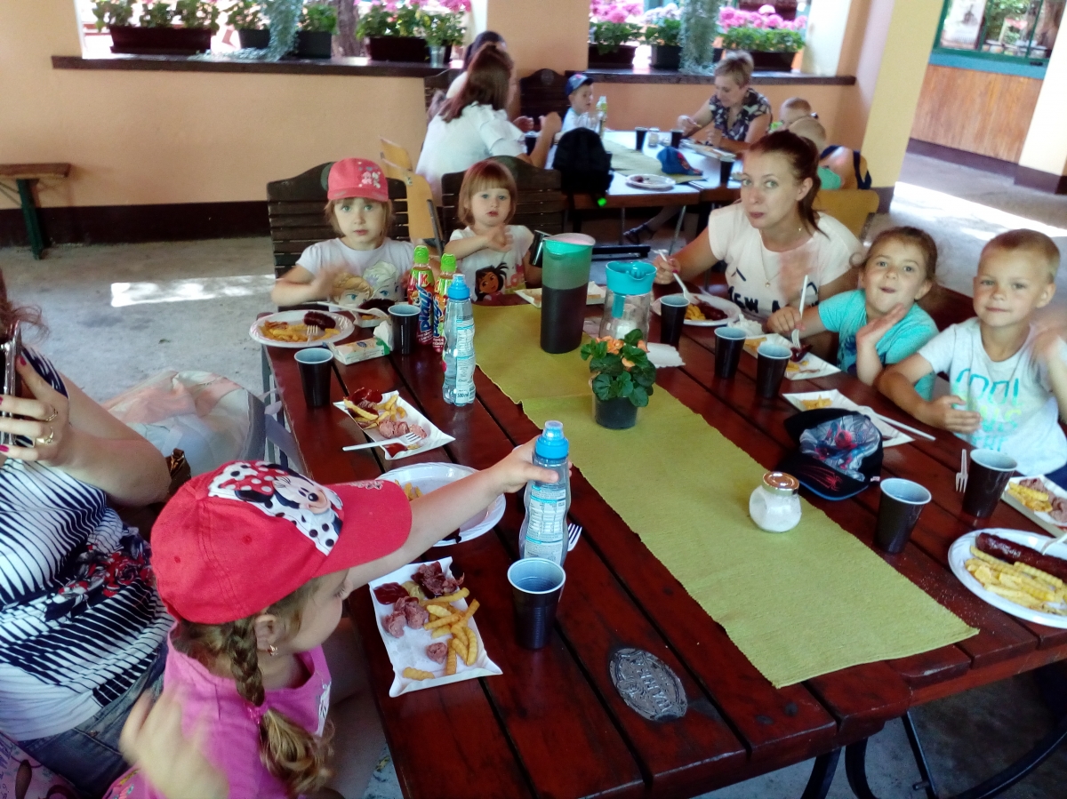 Na zakończenie wycieczki na dzieci czekała miła niespodzianka: pieczona kiełbasa, frytki, ciepła herbata. Po powrocie do przedszkola na wszystkich zmęczonych upałem, ale równocześnie pełnych wrażeń czekały lody owocowe.