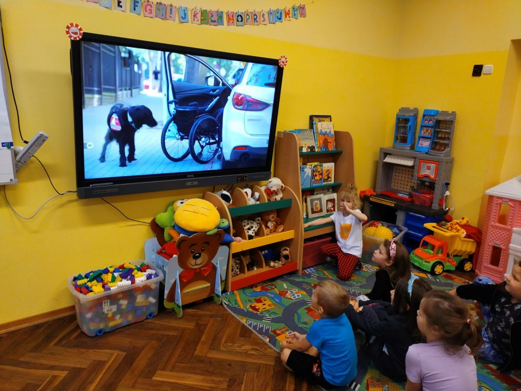 Przedszkolaki poznali historię Kici Koci i jej niepełnosprawnego ruchowo kolegi. Następnie obejrzeli filmik, dotyczący pracy psów asystujących i wykolorowali pieski, nadając im imiona.