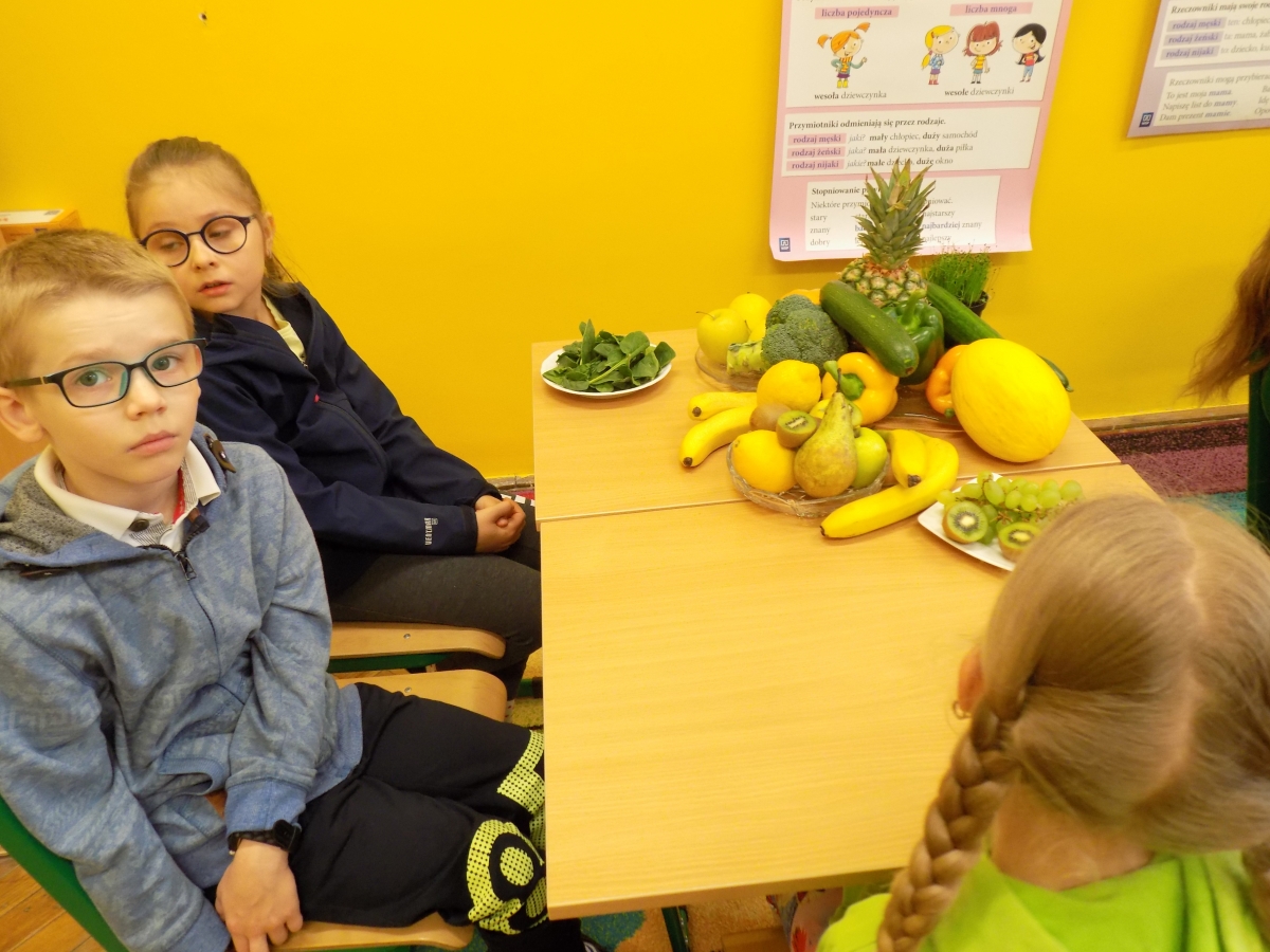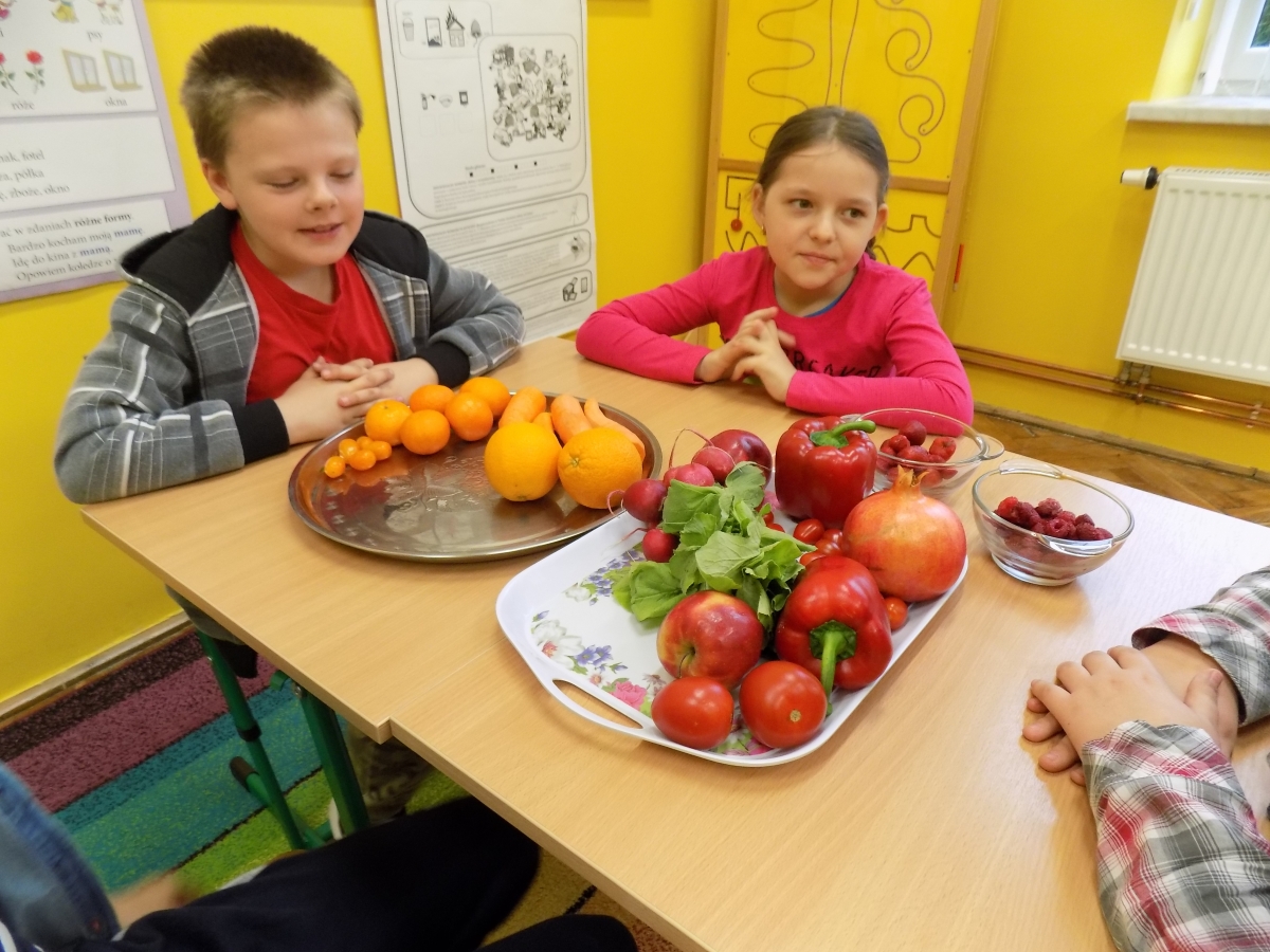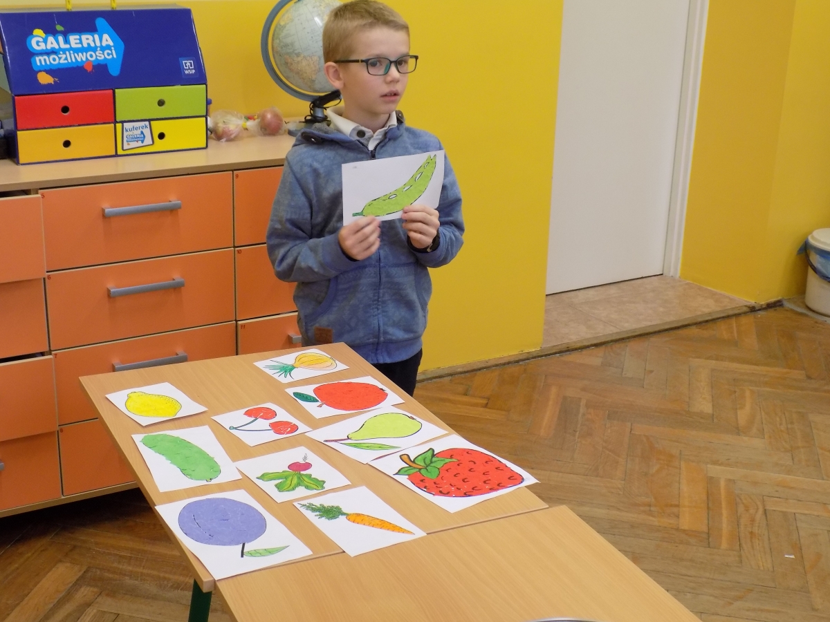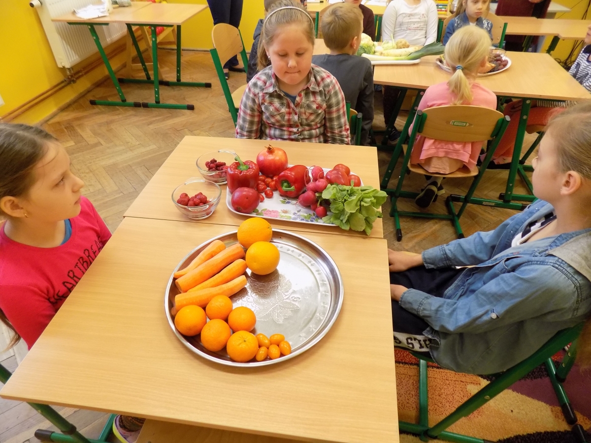 Nauczyciele przy tej okazji opowiadali o wartościach odżywczych warzyw i owoców, grupując je równocześnie kolorami.
