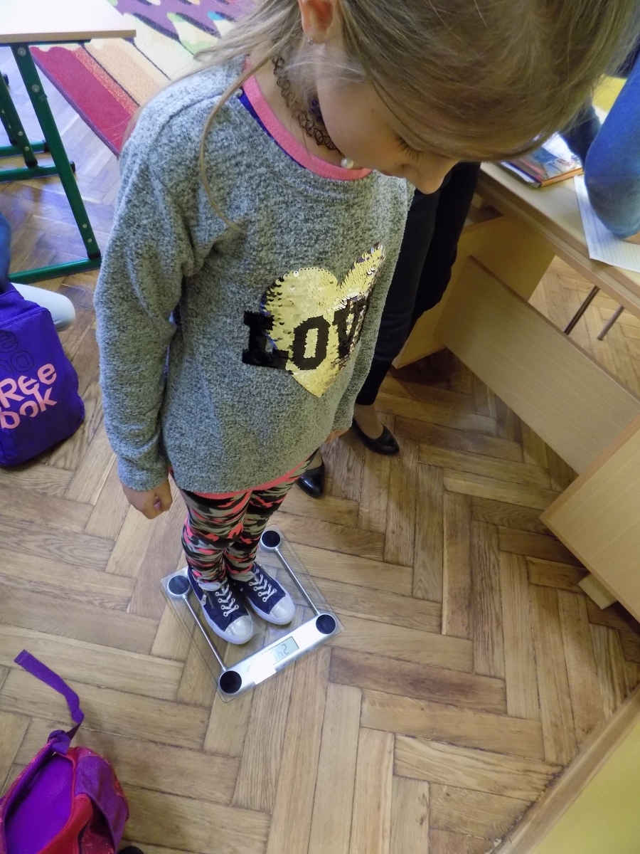 Akcja ta odbyła się 1 października, kiedy to pani dyrektor wraz z panią higienistką Anną Wilk ważyły plecaki szkolne pierwszoklasistów.