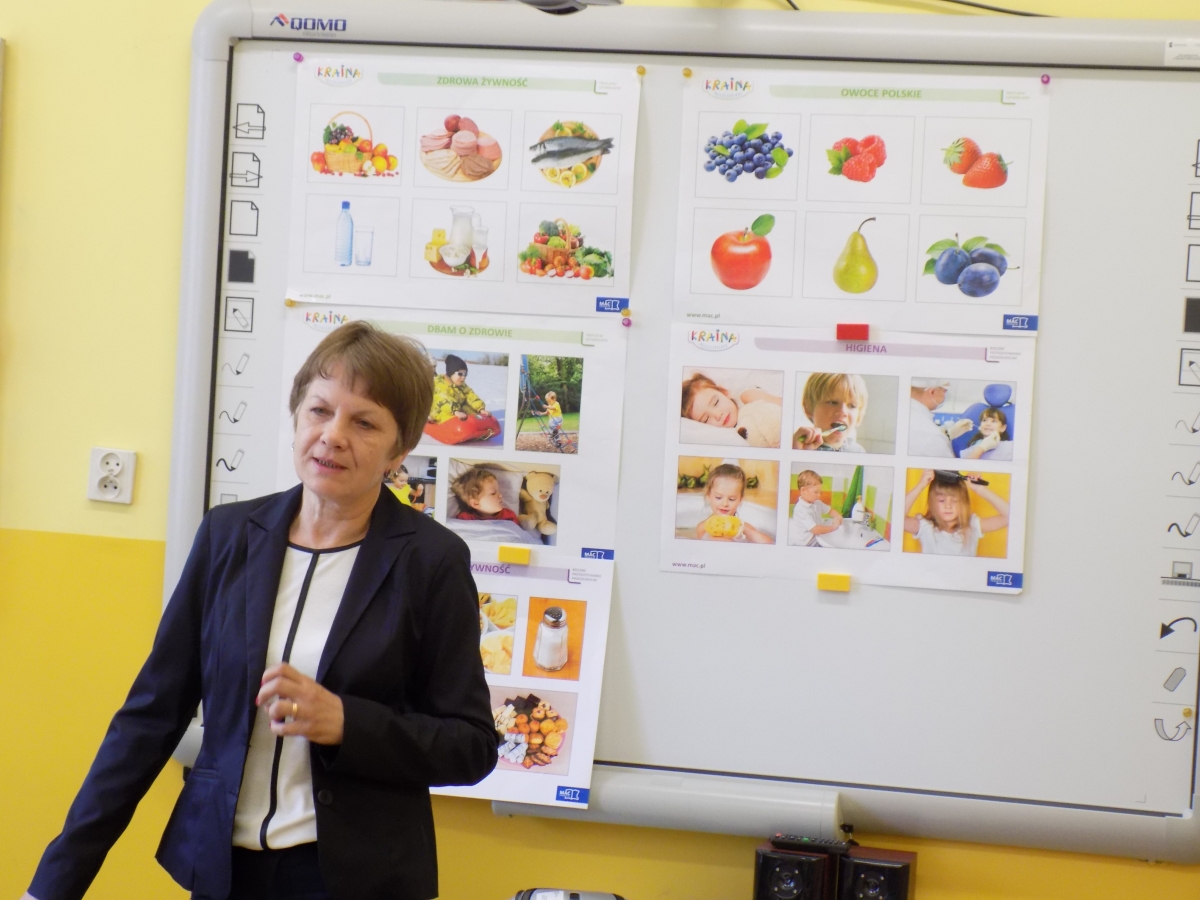 Kolejnym krokiem było spotkanie z panią higienistką panią Marią Wilk dotyczące nowej piramidy żywienia, składu i wartości odżywczych poszczególnych posiłków oraz odpowiedniego ich rozkładu w ciągu dnia.