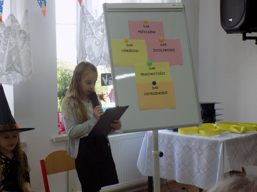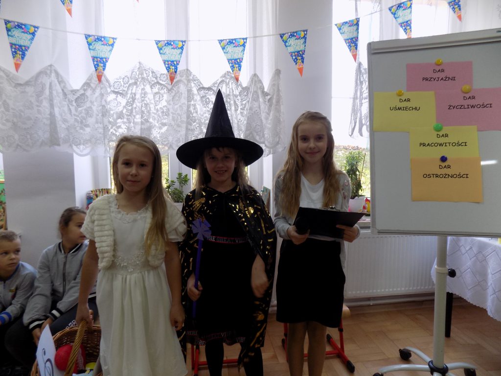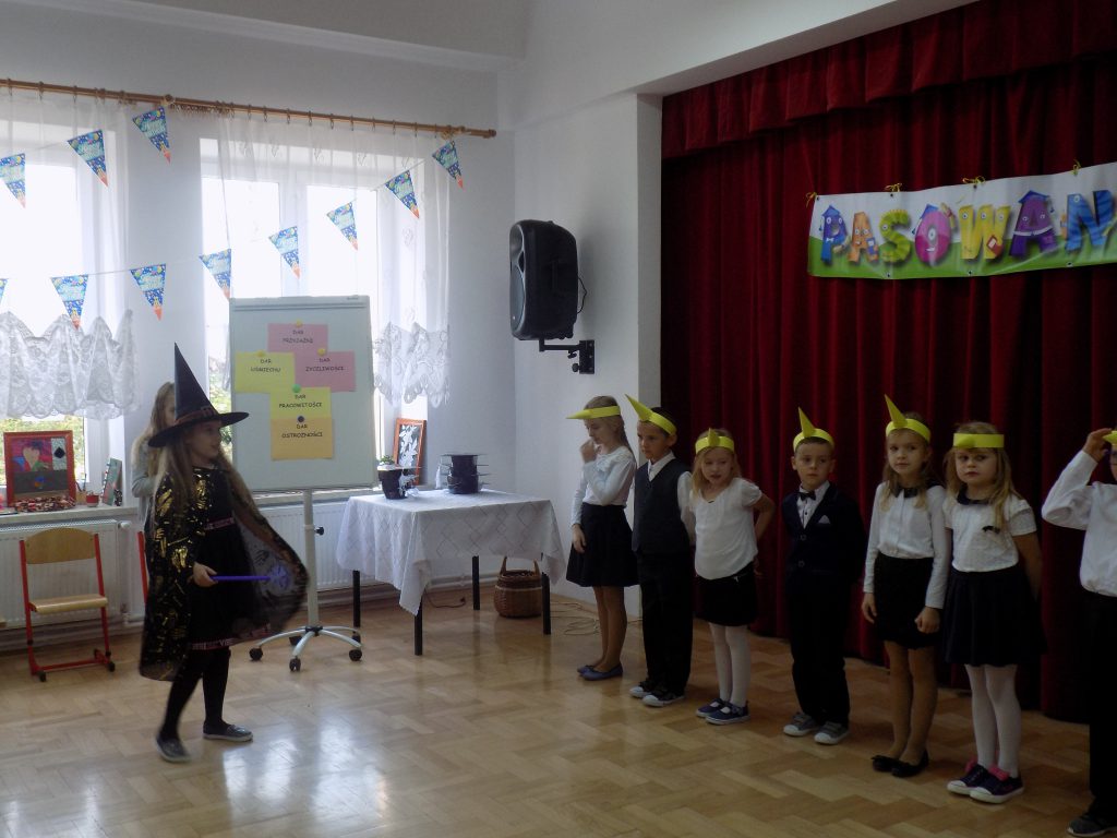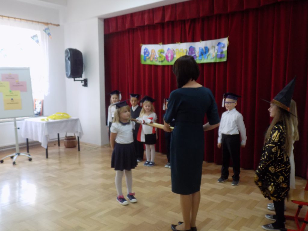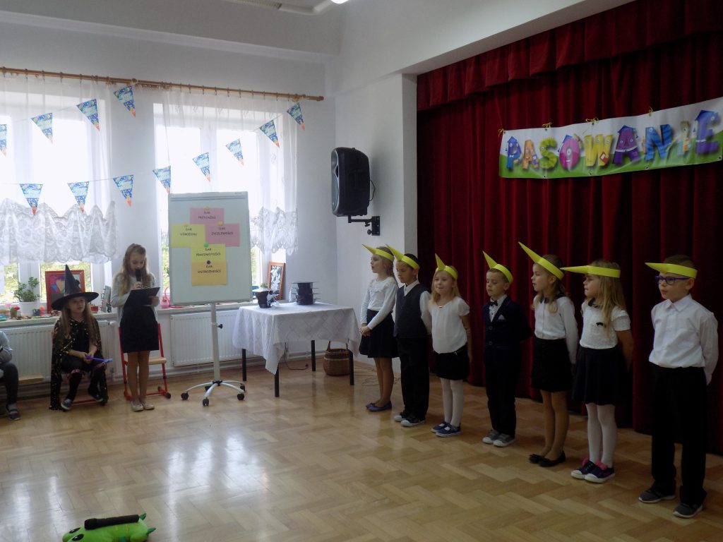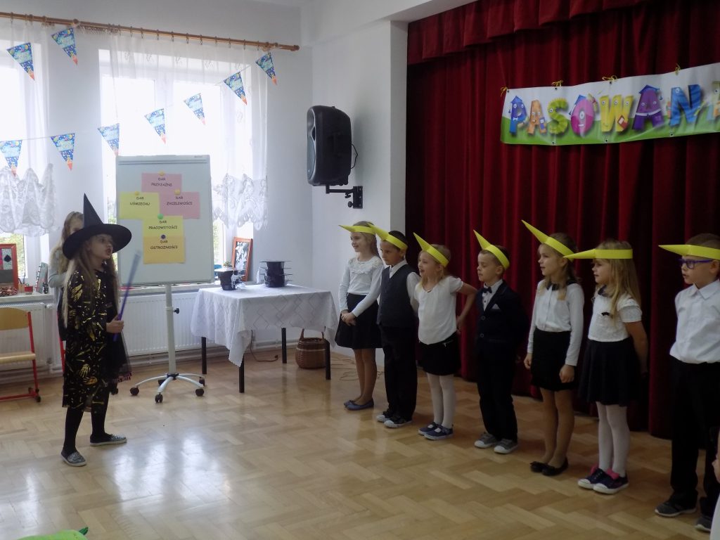 Oczywiście na uroczystość przybyła również zła wróżka, której celem było unieważnienie pasowania, niczym zły chochlik próbowała zmylić pierwszoklasistów i podać im nieprawidłowe odpowiedzi… Na szczęście siedmiu wspaniałych uczniów klasy pierwszej bezbłędnie poradziło sobie z odpowiedziami i tym samym przystąpiło do pasowania przez panią dyrektor.