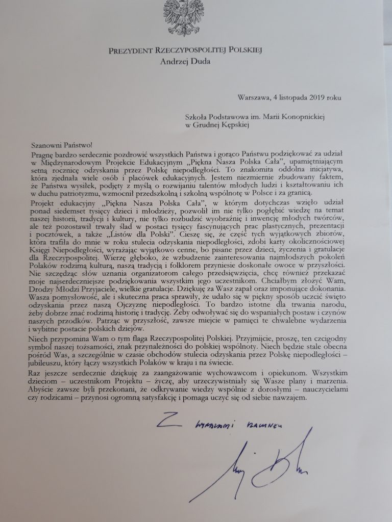 W roku szkolnym 2018/2019 grupa starszaków realizowała szereg działań dotyczących kultywowania tradycji narodowych i szeroko pojętego patriotyzmu. Podziękowaniem za trud włożony w aktywności jest list od Prezydenta Rzeczypospolitej Polskiej Andrzeja Dudy, który wyraził wdzięczność za szerzenie idei rodzimej kultury, tradycji, folkloru. Wskazał również na konieczność pamięci o przodkach, chwalebnych wydarzeniach oraz czynach wybitnych postaci naszych dziejów.