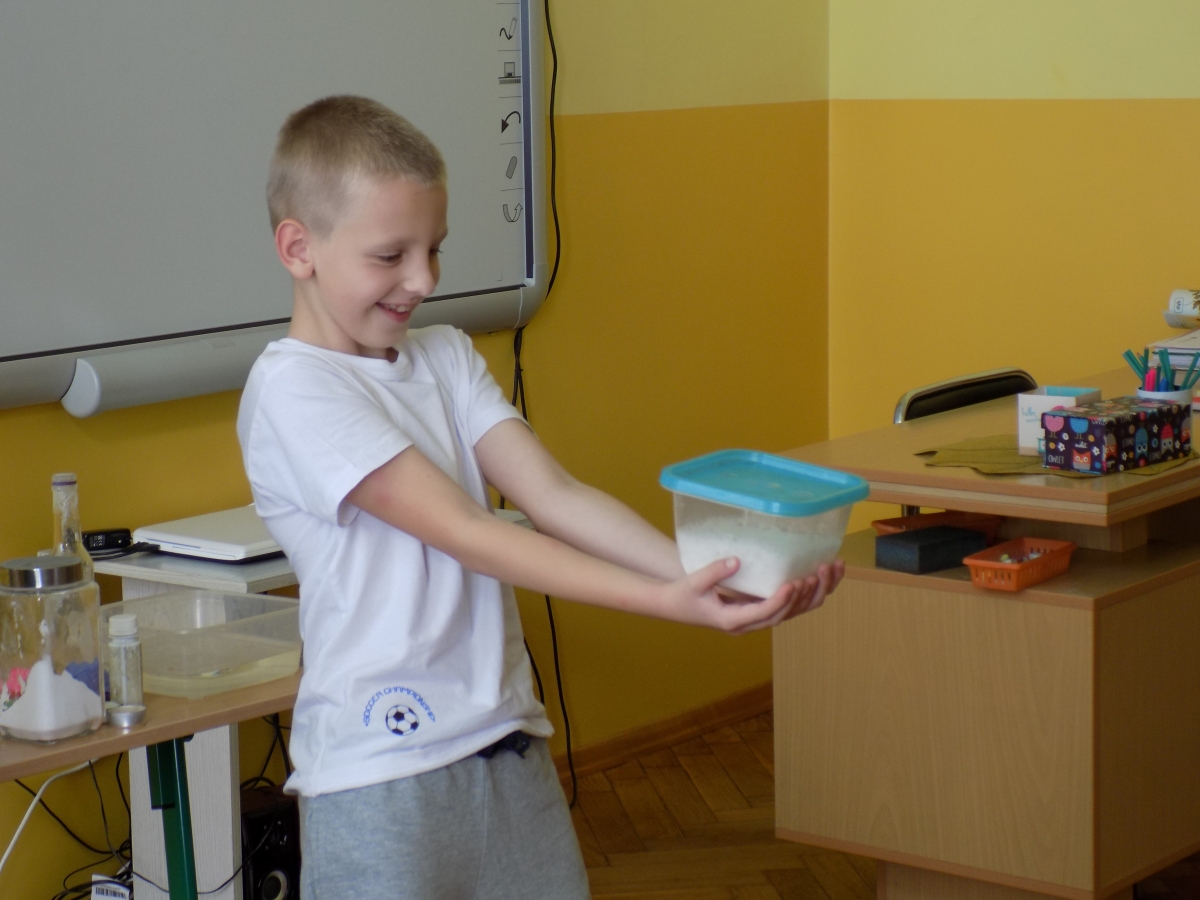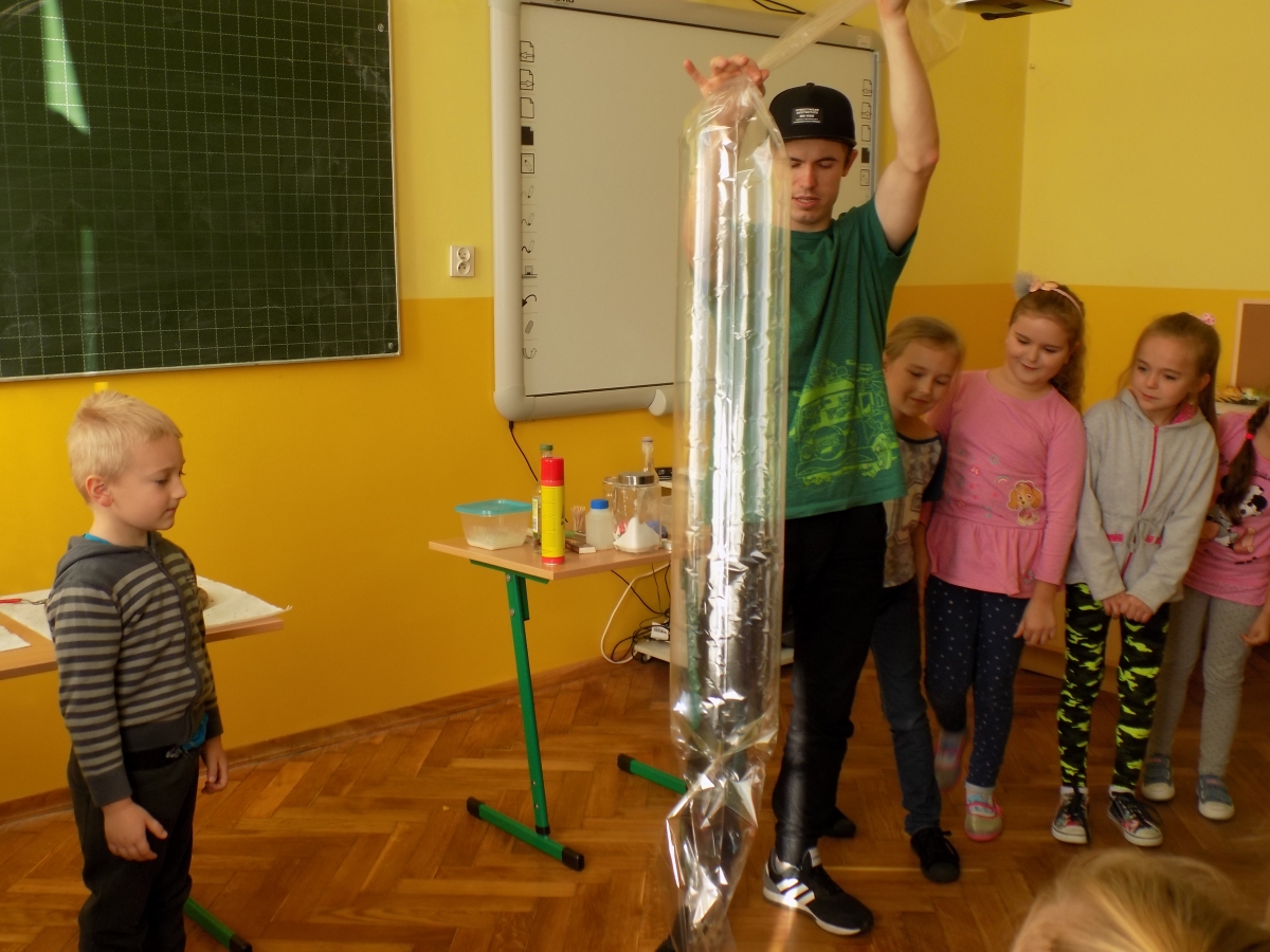 Pan Krzysztof zaprezentował doświadczenia z fizyki i chemii, takie jak: