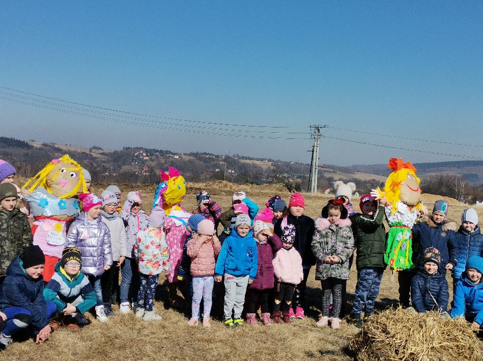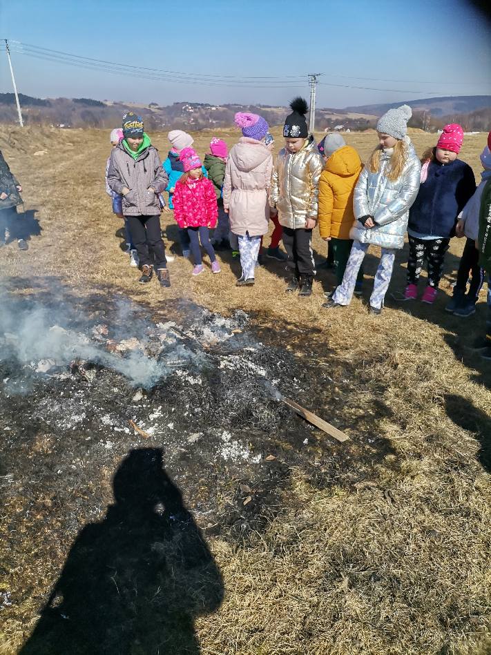 Uczniowie klas I-III naszej szkoły oraz przedszkolaki pod opieką nauczycieli udali się w tym właśnie dniu na boisko szkolne, aby podtrzymać tradycję. Piękna pogoda dopisywała od rana, więc wszyscy nie mogli się doczekać tego momentu, kiedy definitywnie i stanowczo pożegnają zimę, aby przypadkiem Pani Wiosna nie zechciała się rozmyślić i jednak opóźnić swoje przybycie. Wśród gromkich okrzyków żegnających zimę, a witających wiosnę oraz przy śpiewie wiosennych piosenek i recytacji wierszy spalono doszczętnie kukłę.
