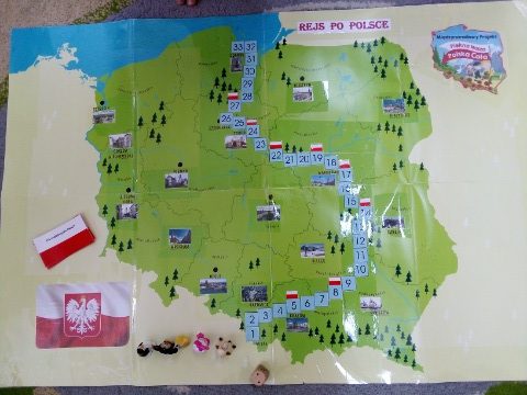 Dzieci z oddziału przedszkolnego w Grudnej Kępskiej zrealizowały swoje szóste zadanie z Międzynarodowego Projektu Edukacyjnego “Piękna Nasza Polska Cała” – Gramy w biało-czerwone, Wspólnymi siłami wykonaliśmy grę planszową pt. „Rejs po Polsce”. Zasada naszej gry jest prosta, jest to tak zwana „ściganka”, czyli ile oczek wyrzucisz tyle przesuwasz się do przodu.