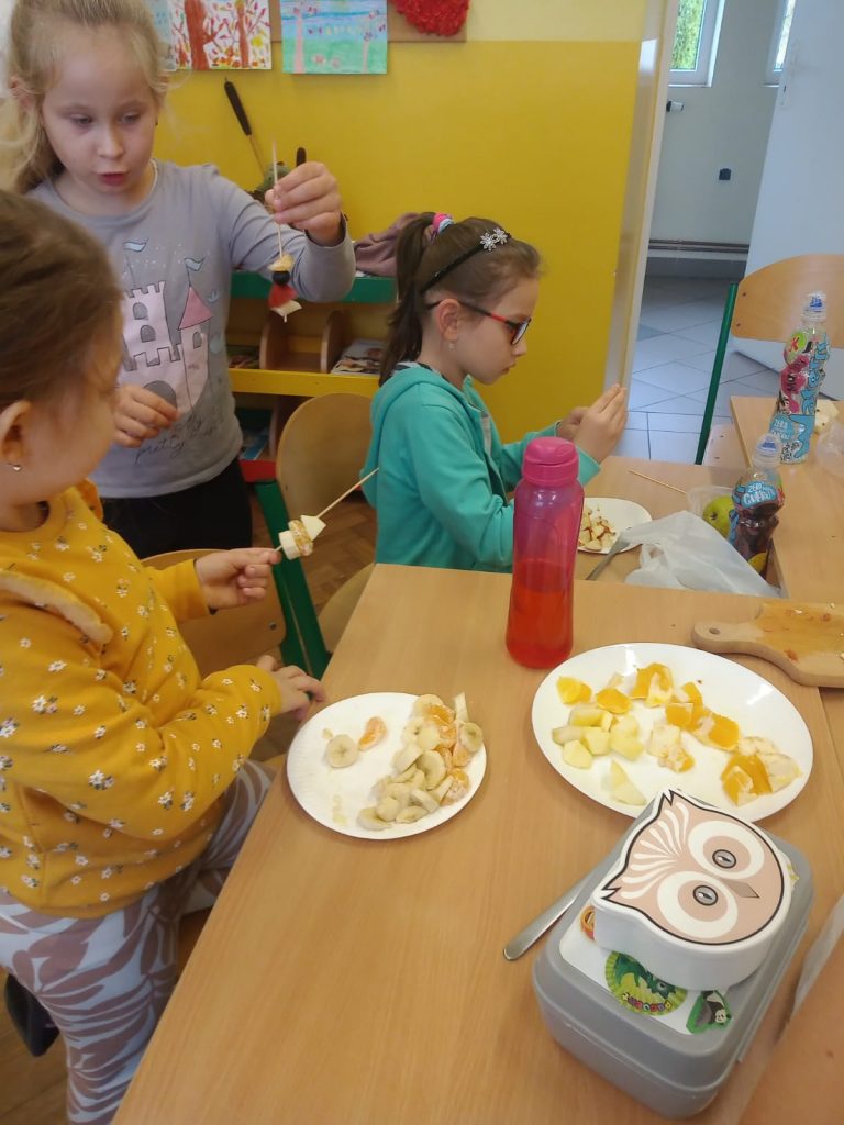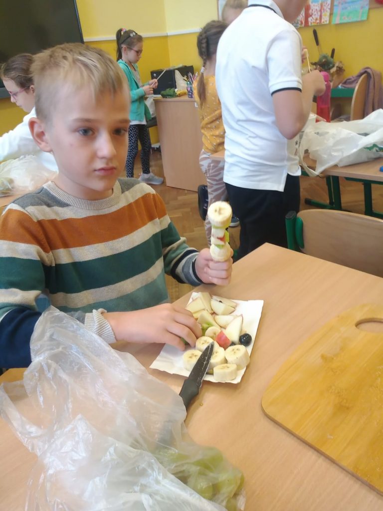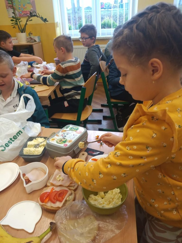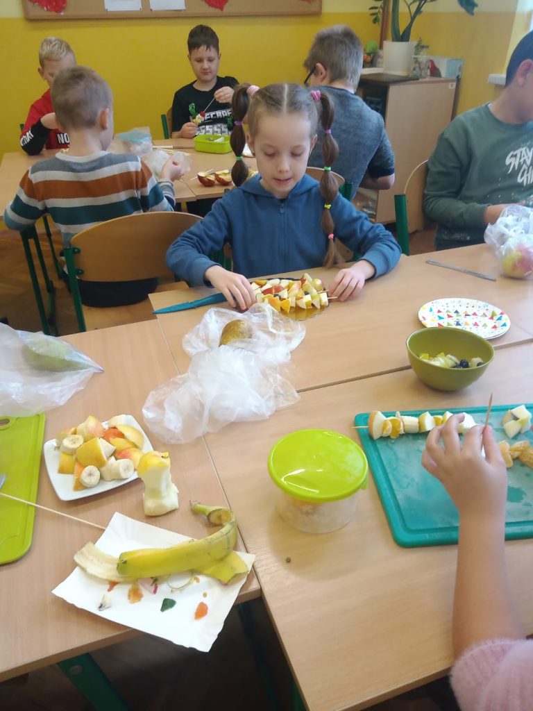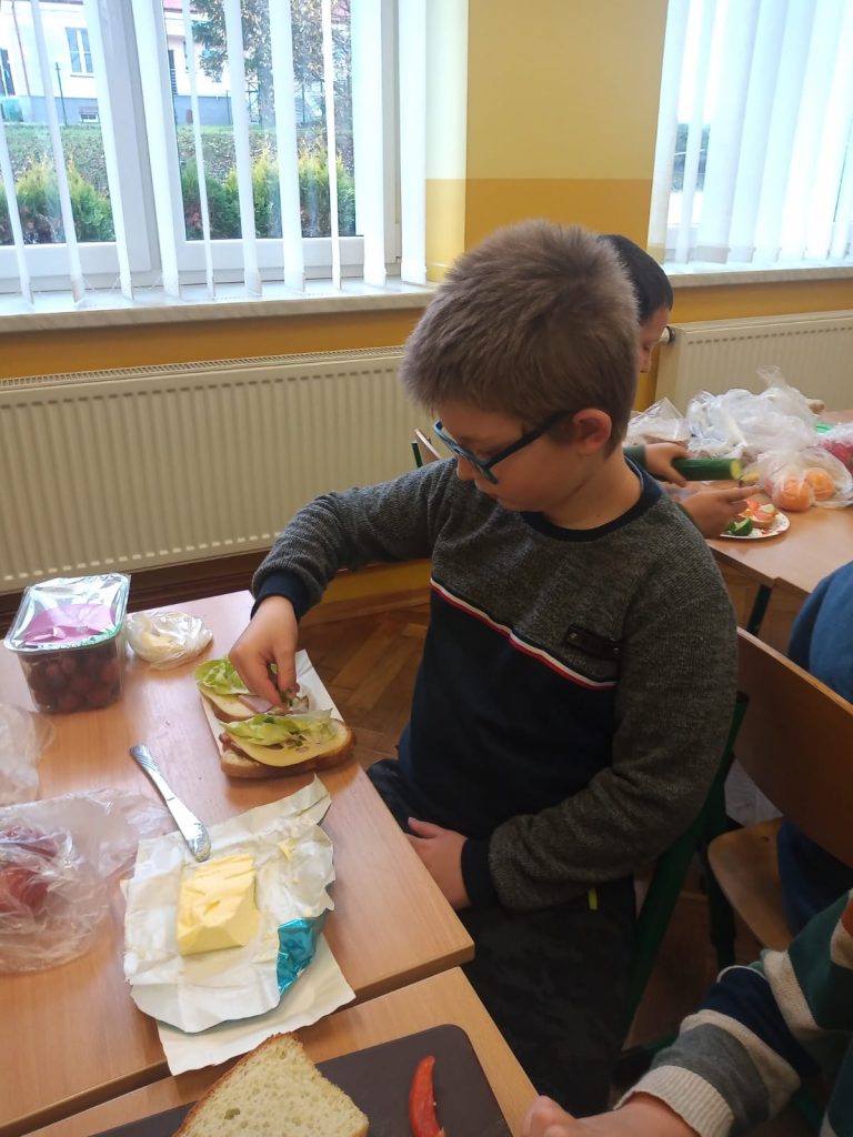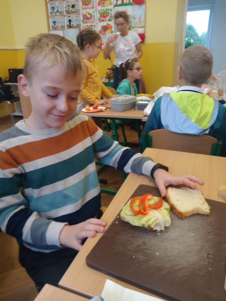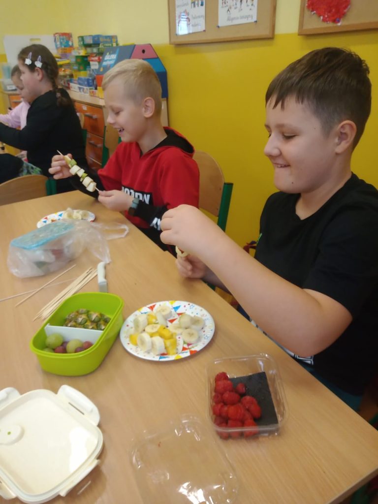 W poniedziałek 13 listopada uczniowie naszej szkoły w ramach promocji zdrowego żywienia samodzielnie przygotowali pyszne śniadanie z przyniesionych ze sobą produktów. Po starannym umyciu rąk, przygotowaniu stanowisk wszyscy razem zabrali się do pracy. Uczniowie samodzielnie smarowali pieczywo masłem i układali wybrane przez siebie produkty, m.in. ser, szynkę, pomidory, ogórki, paprykę, sałatę, szczypiorek. Można powiedzieć, że zadanie wykonali doskonale. Kanapki były nie tylko smaczne i zdrowe, ale też pięknie ozdobione. Po zjedzeniu śniadania, uczniowie zabrali się do przygotowania deseru ze świeżych owoców – szaszłyków owocowych. Samodzielnie nabijali na patyczki kawałki owoców tworząc pyszne, a zarazem zdrowe szaszłyki. Degustacja była udana,