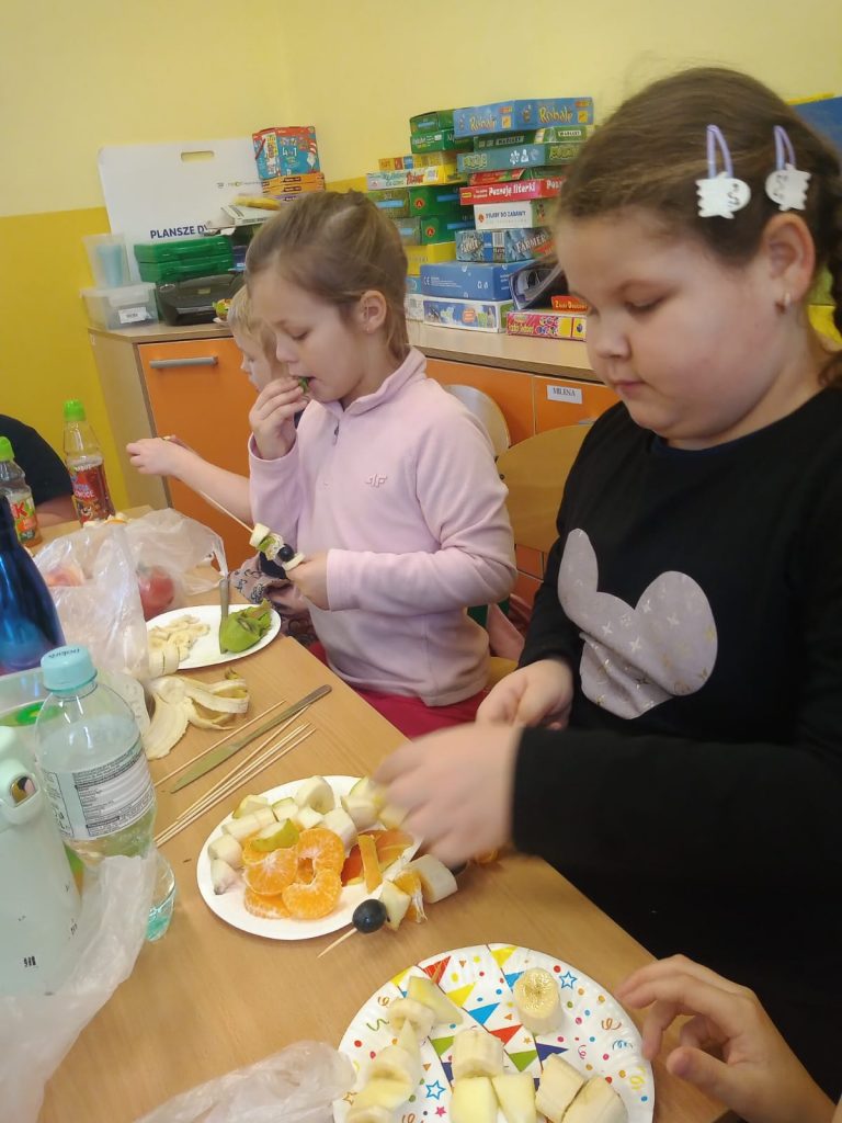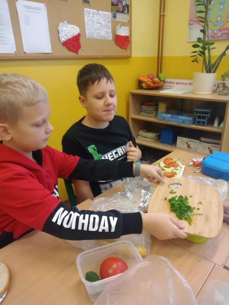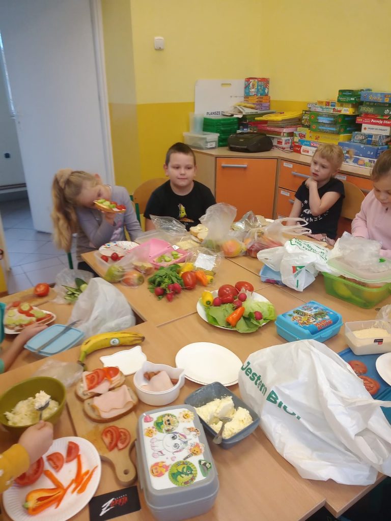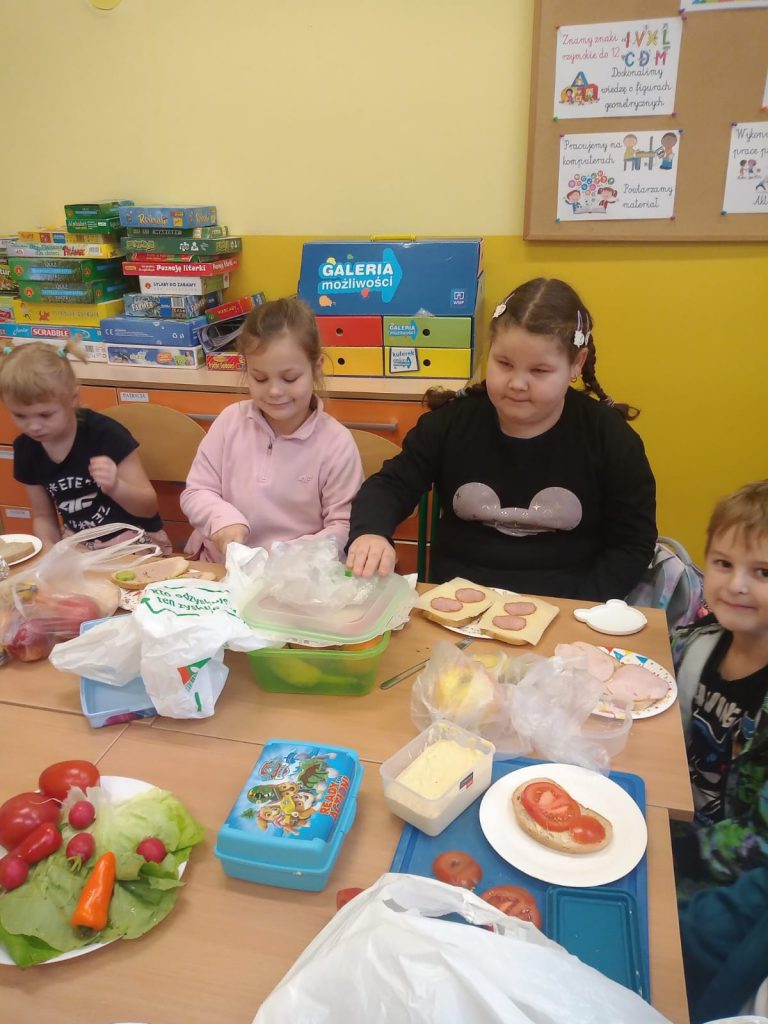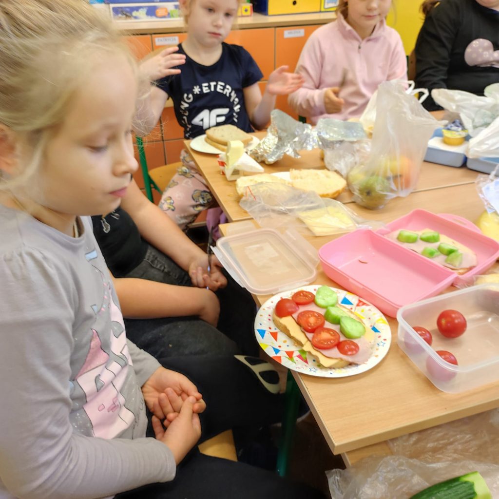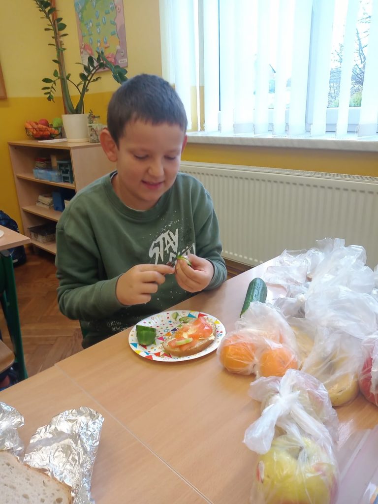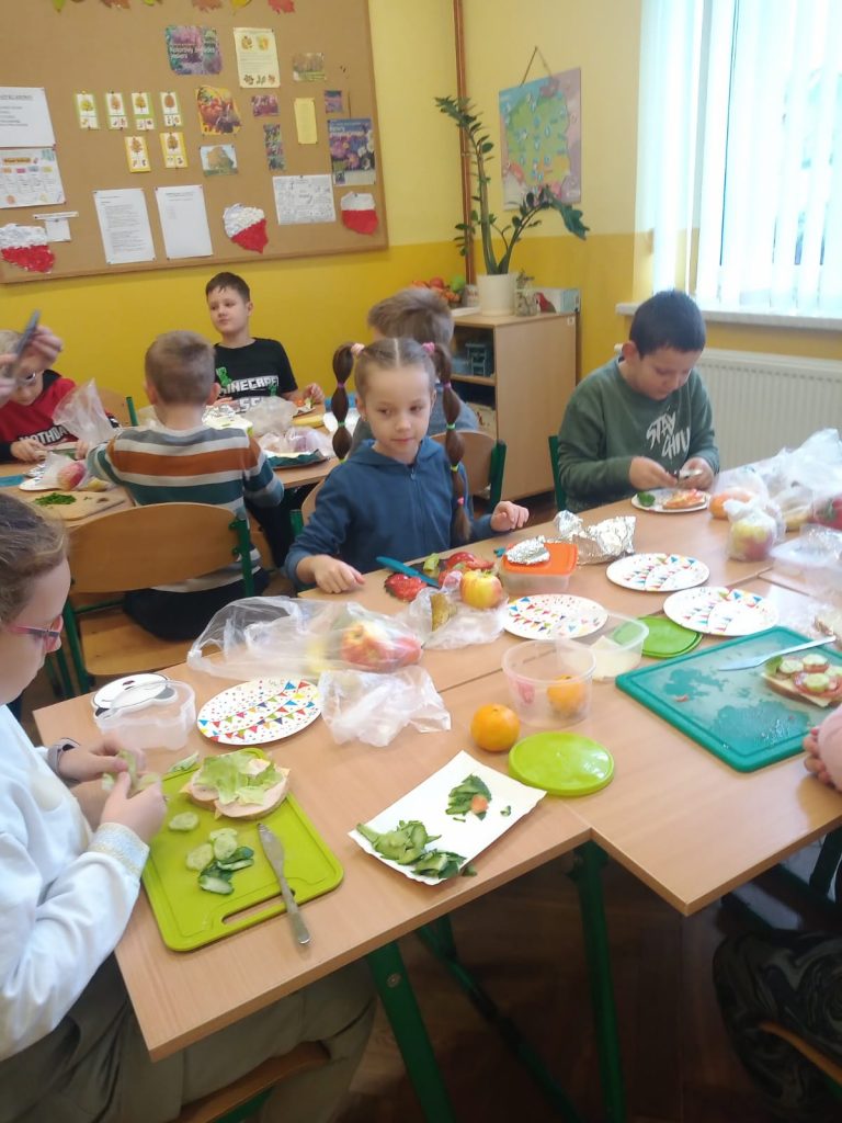 W poniedziałek 13 listopada uczniowie naszej szkoły w ramach promocji zdrowego żywienia samodzielnie przygotowali pyszne śniadanie z przyniesionych ze sobą produktów. Po starannym umyciu rąk, przygotowaniu stanowisk wszyscy razem zabrali się do pracy. Uczniowie samodzielnie smarowali pieczywo masłem i układali wybrane przez siebie produkty, m.in. ser, szynkę, pomidory, ogórki, paprykę, sałatę, szczypiorek. Można powiedzieć, że zadanie wykonali doskonale. Kanapki były nie tylko smaczne i zdrowe, ale też pięknie ozdobione. Po zjedzeniu śniadania, uczniowie zabrali się do przygotowania deseru ze świeżych owoców – szaszłyków owocowych. Samodzielnie nabijali na patyczki kawałki owoców tworząc pyszne, a zarazem zdrowe szaszłyki. Degustacja była udana,