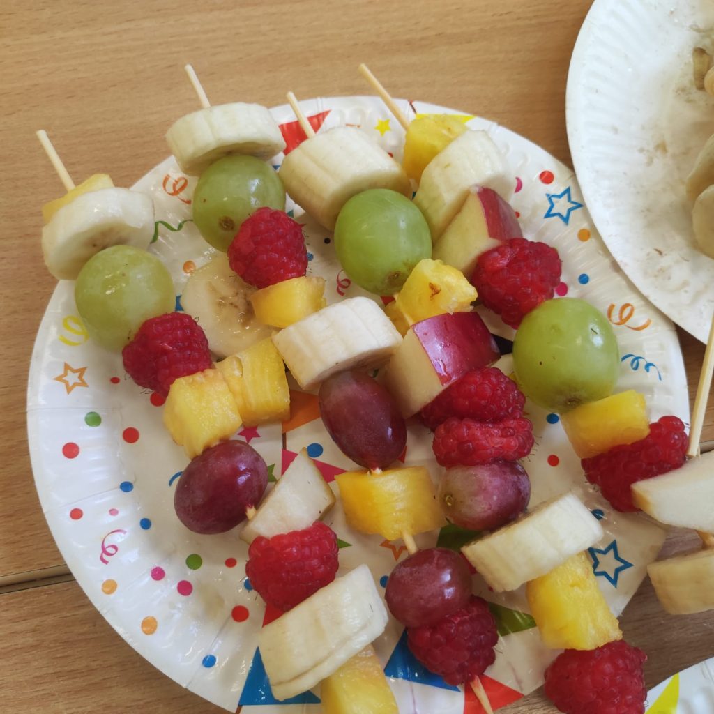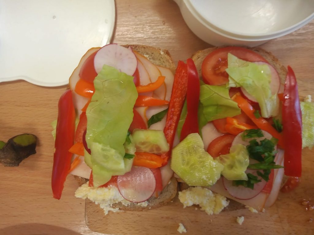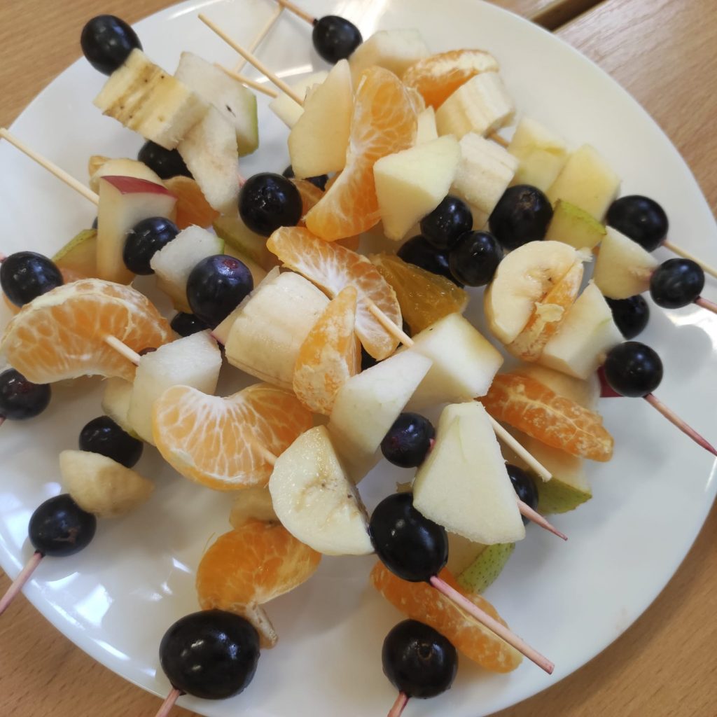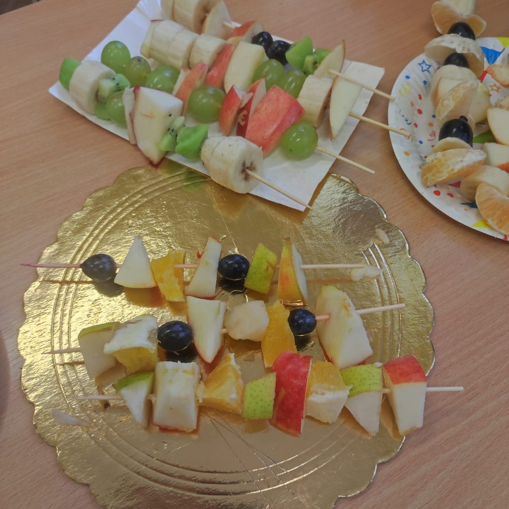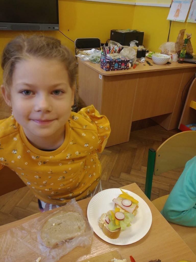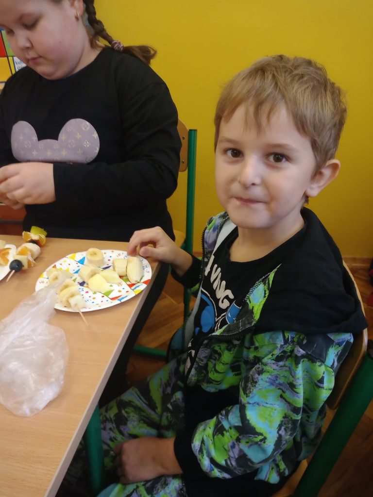 W poniedziałek 13 listopada uczniowie naszej szkoły w ramach promocji zdrowego żywienia samodzielnie przygotowali pyszne śniadanie z przyniesionych ze sobą produktów. Po starannym umyciu rąk, przygotowaniu stanowisk wszyscy razem zabrali się do pracy. Uczniowie samodzielnie smarowali pieczywo masłem i układali wybrane przez siebie produkty, m.in. ser, szynkę, pomidory, ogórki, paprykę, sałatę, szczypiorek. Można powiedzieć, że zadanie wykonali doskonale. Kanapki były nie tylko smaczne i zdrowe, ale też pięknie ozdobione. Po zjedzeniu śniadania, uczniowie zabrali się do przygotowania deseru ze świeżych owoców – szaszłyków owocowych. Samodzielnie nabijali na patyczki kawałki owoców tworząc pyszne, a zarazem zdrowe szaszłyki. Degustacja była udana,