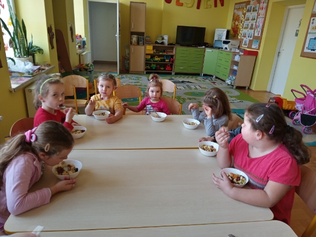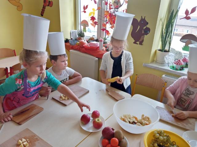 Jedną z form zapoznawania dzieci z zasadami zdrowego żywienia jest zachęcanie do zjadania warzyw i owoców. W tym celu przedszkolaki przygotowywały sałatkę owocową. Na początku dzieci rozwiązywały zagadki o owocach, wysłuchały i śpiewały piosenkę „Idą witaminki”. Dowiedziały się także dlaczego należy jeść owoce. Potem nastąpiło omówienie sposobu wykonania sałatki