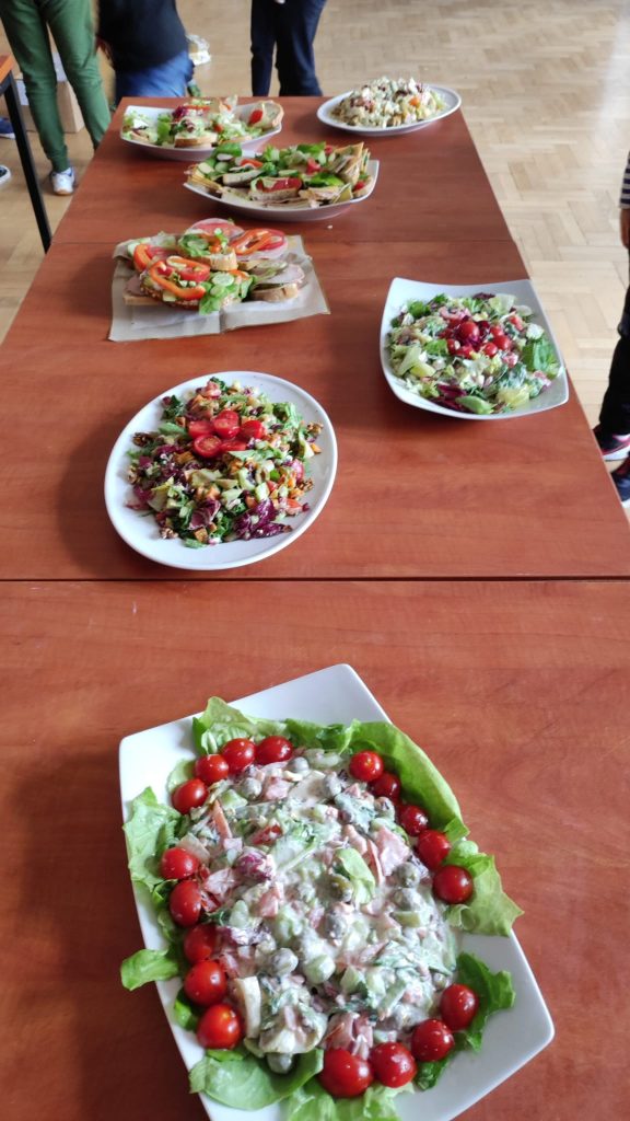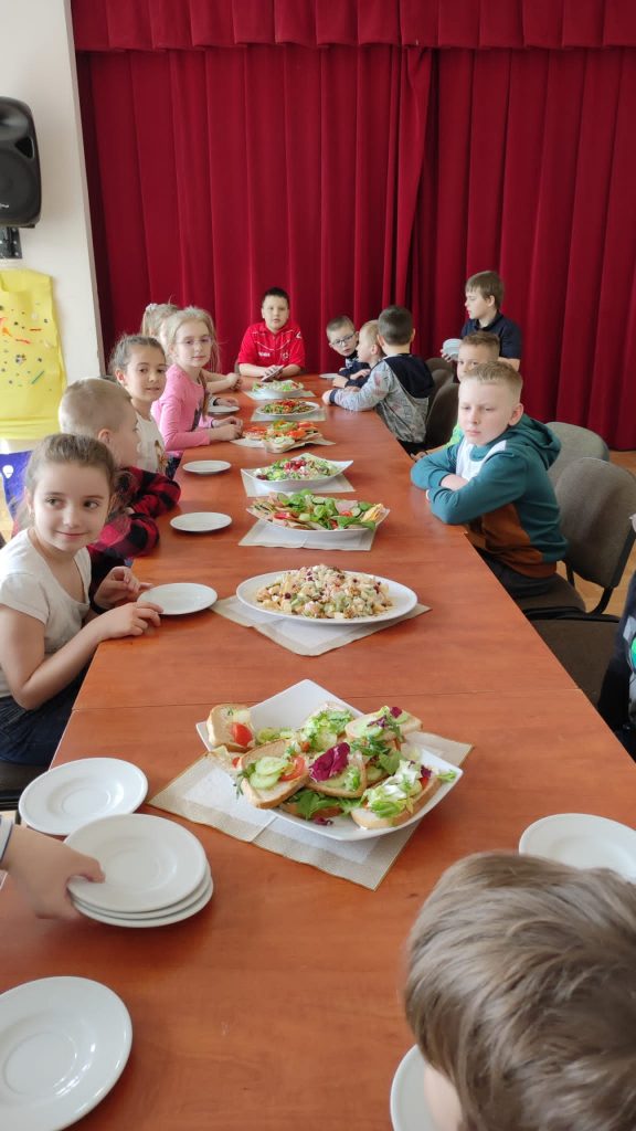Środa 6 kwietnia. – była pysznym, owocowo – warzywnym dniem. Każdy wie, jak ważne jest jedzenie owoców i warzyw – nie tylko dlatego, że są smaczne, ale przede wszystkim – zawierają mnóstwo witamin, które chronią i wzmacniają nasz organizm. Dlatego też nasi uczniowie postanowili zrobić pyszne i sałatki owocowe i warzywne oraz smaczne i zdrowe kanapki