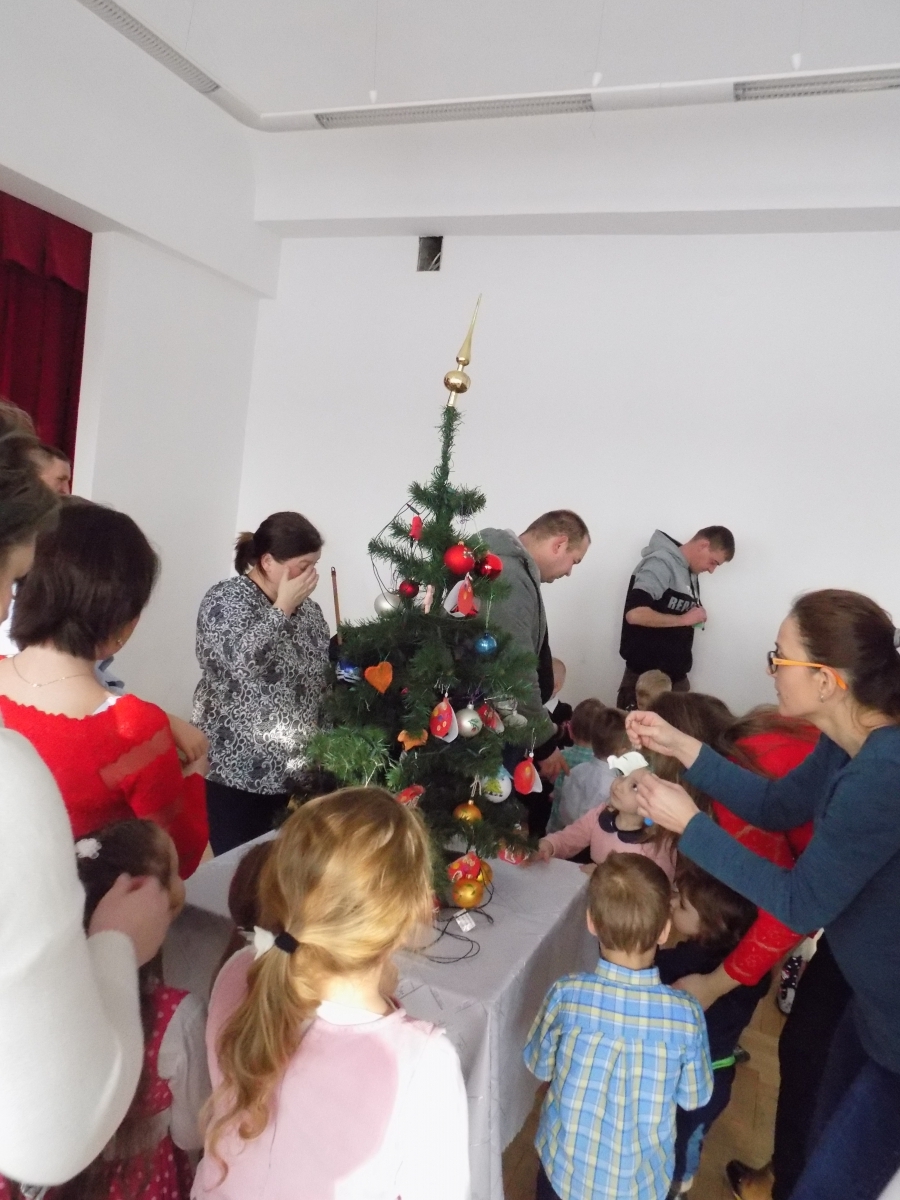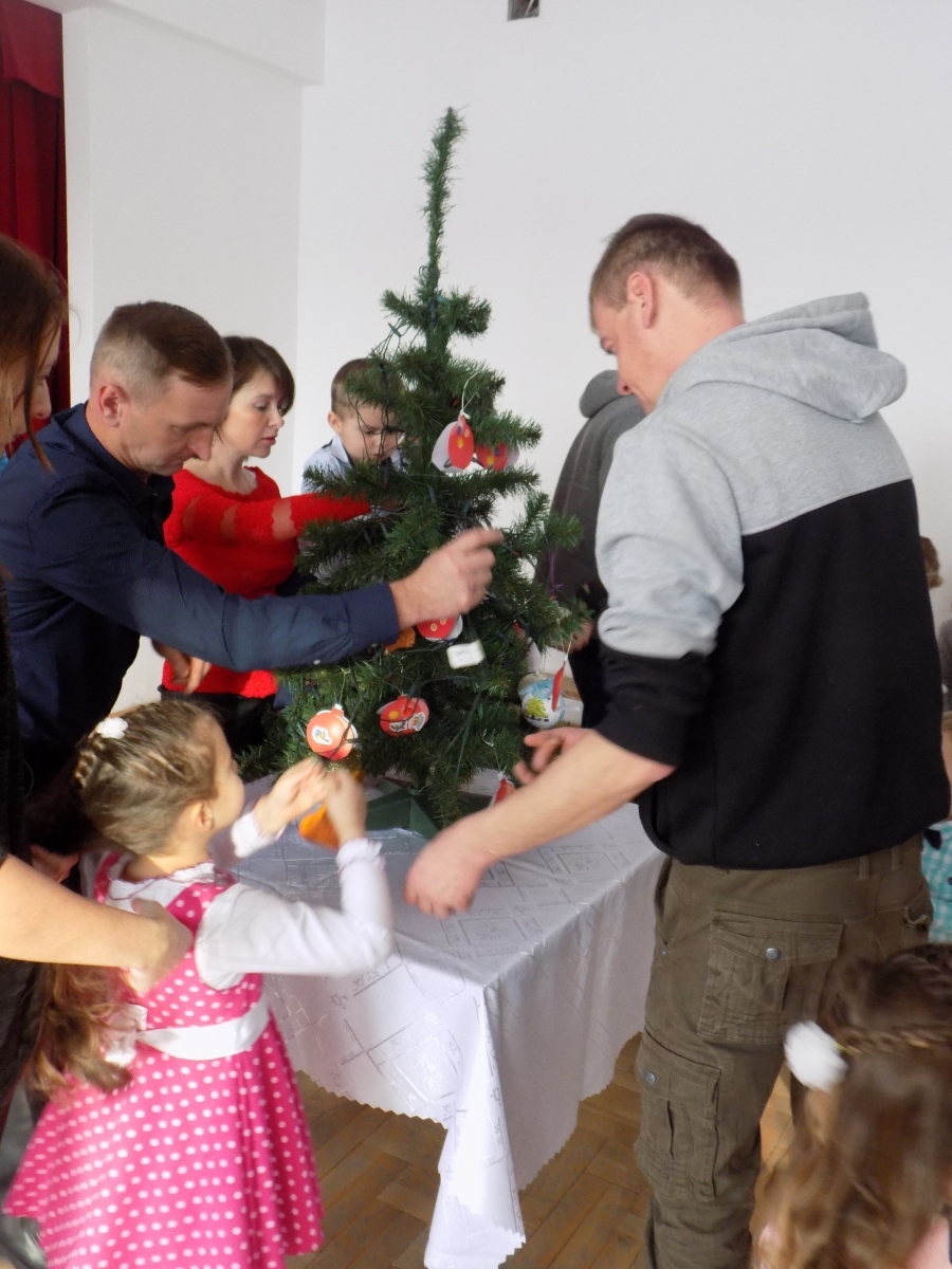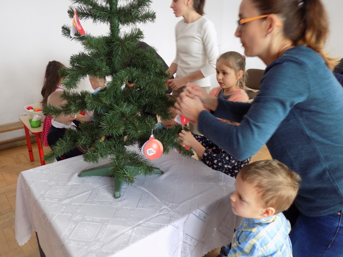 Uczestniczyli w krótkim montażu słowno-muzycznym swoich pociech, a następnie wzięli udział w warsztatach wykonywania bombki bożonarodzeniowej, wspólnie dekorowali choinkę.