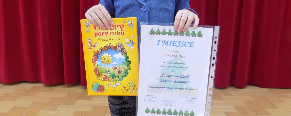 pt: „Świąteczna Kartka Bożonarodzeniowa” zorganizowanym przez Przedszkole Nr 66 w Łodzi, natomiast Amelia Biernacka- uczennica klasy I zdobyła I miejsce na dystansie 25 m stylem dowolnym w zawodach pływackich zorganizowanych przez Ośrodek Rekreacji i Sportu w Gorlicach