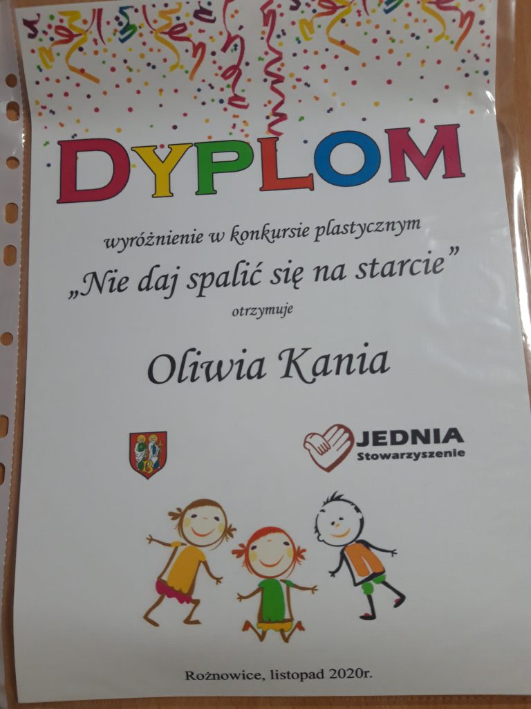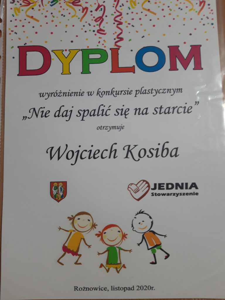 Miło nam poinformować, że Wojciech Kosiba, Wiktor Czech, Amelia Buś, Oliwia Kania zdobyli wyróżnienie w Gminnym Konkursie Plastycznym „Nie daj się spalić na starcie”.
