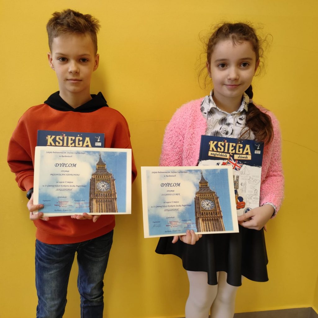 Miło nam poinformować, że uczniowie z klasy III – Zuzanna Szurek i Przemysław Stankowski zdobyli II miejsce w II Edycji Gminnego Konkursu z Języka Angielskiego „Englishiada”, którego organizatorem była Szkoła Podstawowa im. Stefana Czarnieckiego w Racławicach.