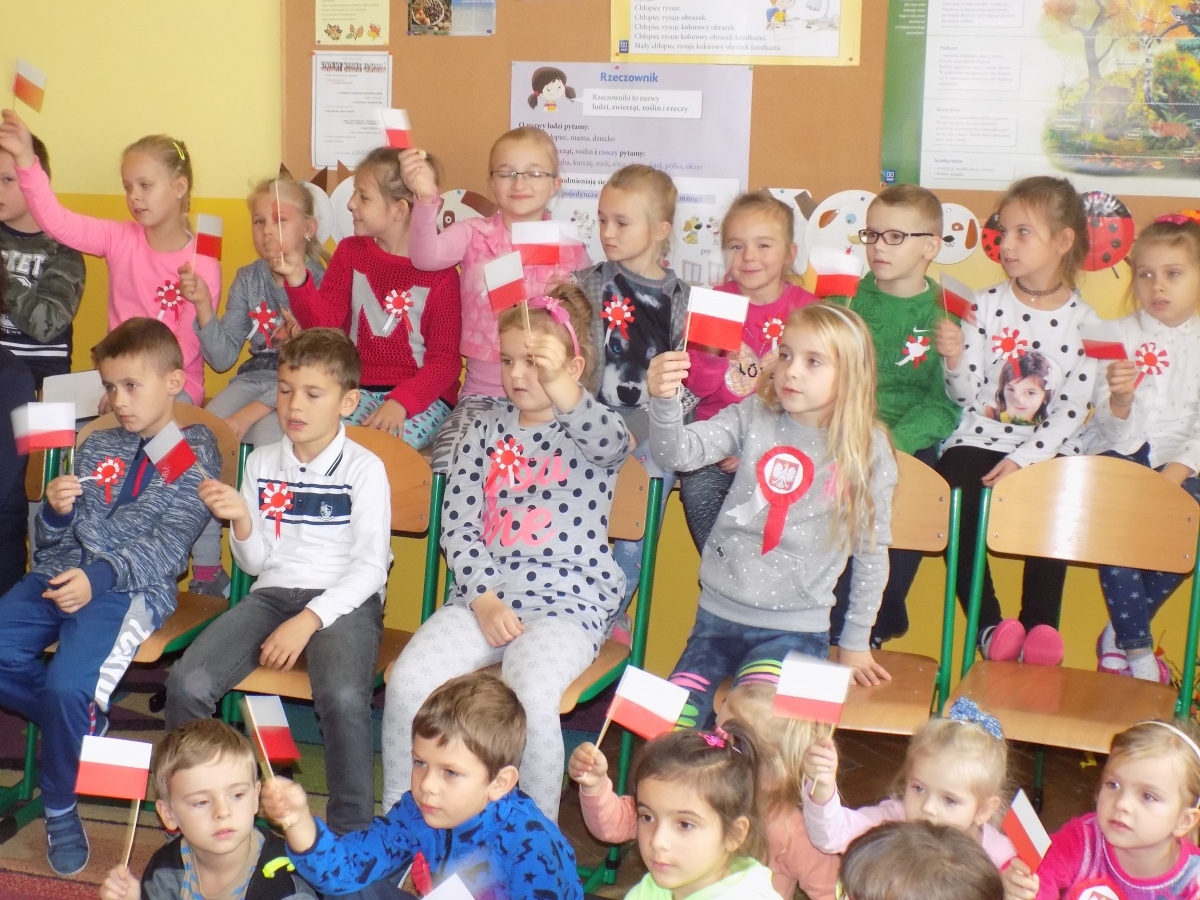 Dzieci obejrzały prezentację dotyczącą symboli narodowych, odśpiewały hymn narodowy. Najmłodsze przedszkolaki w prezencie przygotowały wszystkim własnoręcznie wykonane flagi.