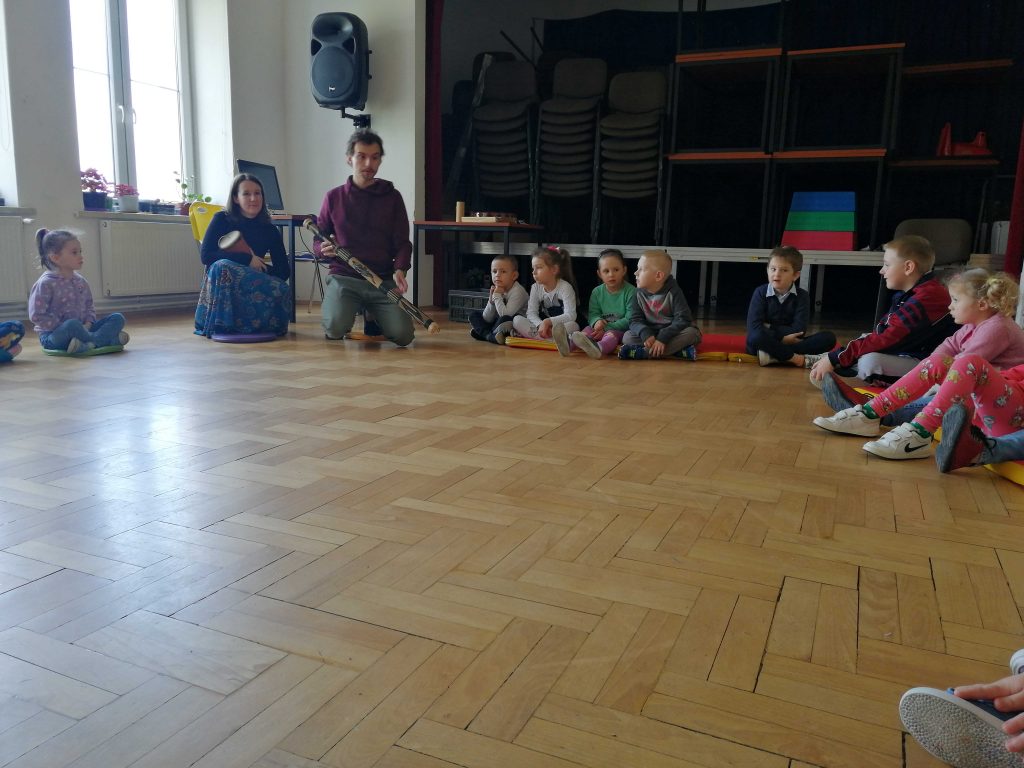 W dniu 13 kwietnia br. obie grupy przedszkolne uczestniczyły w zajęciach dotyczących rozpoznawania i nazywania emocji. Państwo prowadzący warsztaty pokazali dzieciom piękne instrumenty pochodzące z odległych krajów, które następnie były wykorzystane w dalszej części zajęć. Przedszkolaki brały czynny i aktywny udział w opowiadanej przez naszych gości bajce o emocjach. Dzieci wykazywały ogromne zainteresowanie opowieścią, a także chętnie wcielały się w wybrane przez siebie rolę. Na koniec podsumowane i utrwalone zostały poszczególne emocje wymienione wcześniej w czasie warsztatów.