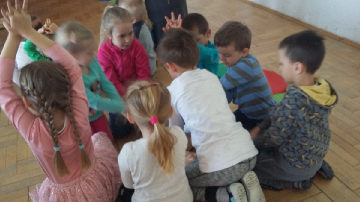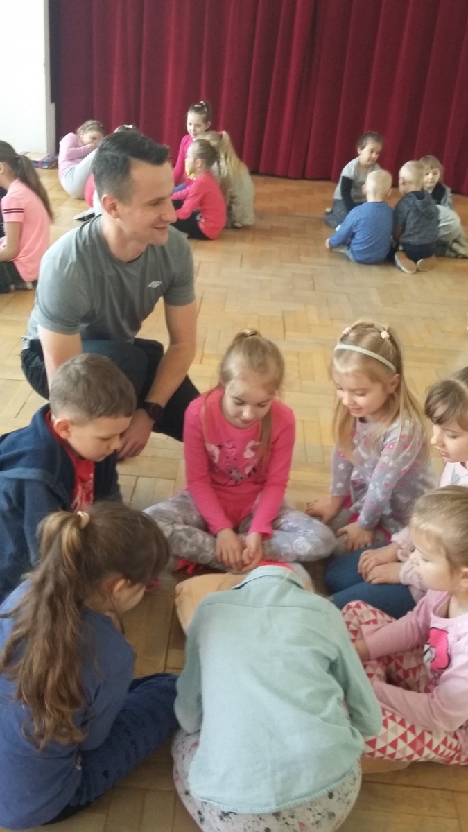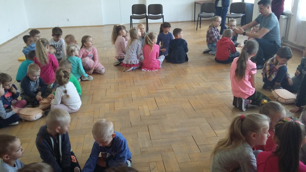 Pan Marek opowiadał o sposobach weryfikowania stanu osoby poszkodowanej, wzywania pierwszej pomocy przy użyciu numeru alarmowego 112, a także sposobach udzielania pierwszej pomocy. Dzieci ćwiczyły w grupach na fantomach oraz sprawnie wykonywały polecenia bandażowania, opatrywania ran czy pomocy podczas zasłabnięcia.