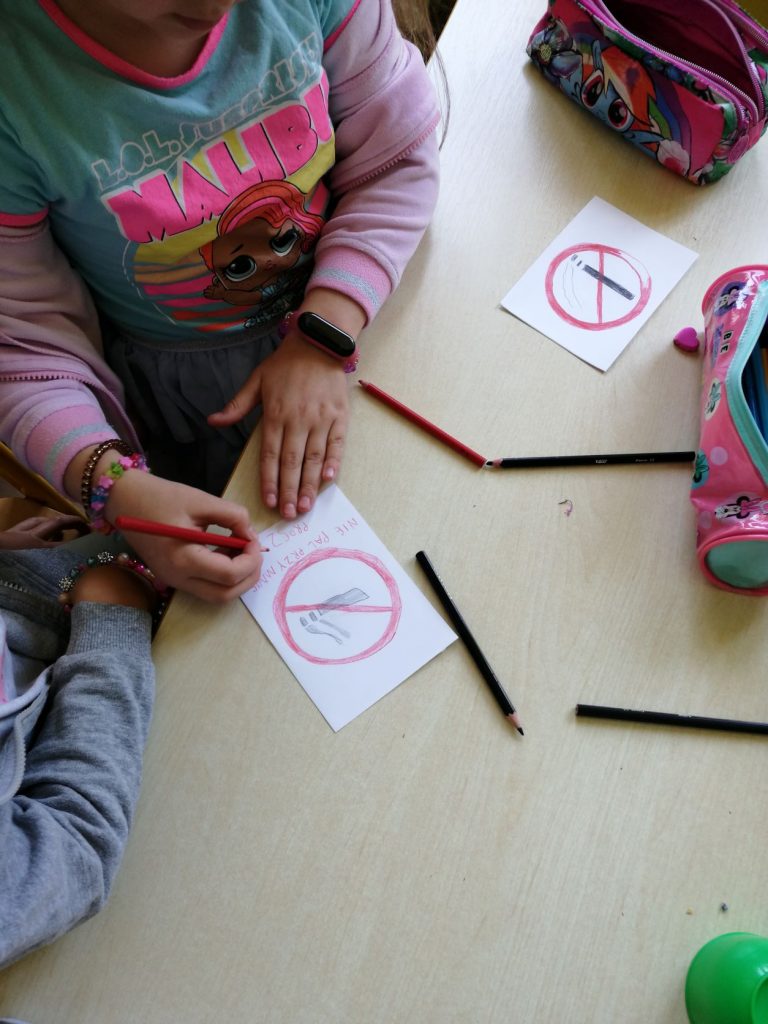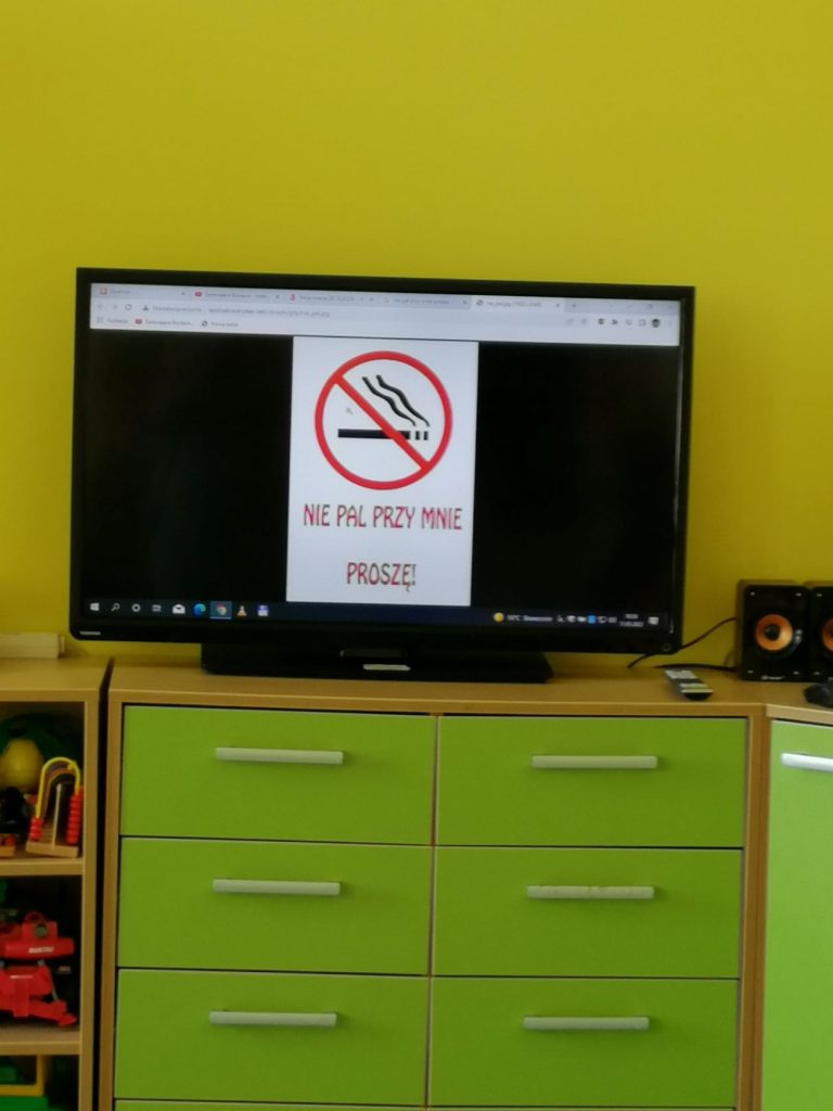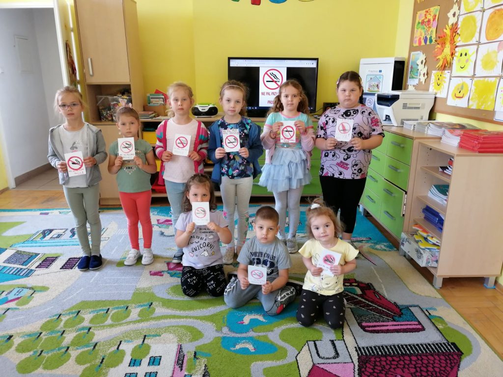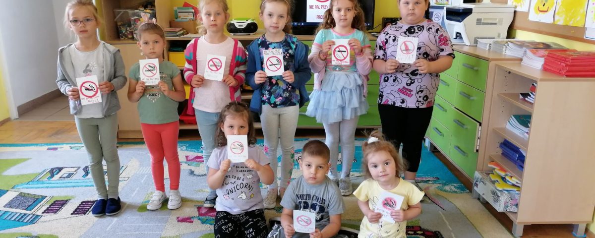 W ramach Przedszkolnego Programu Edukacji Antytytoniowej „Czyste Powietrze Wokół Nas” w naszym przedszkolu zostały przeprowadzone zajęcia, w czasie których dzieci obejrzały film edukacyjny pt. „Dlaczego musimy zadbać o czyste powietrze? Czym jest smog?”. Przedszkolaki wysłuchały opowiadania pt. „O kominie, który przestał dymić” Oldrich Syrovatkaz czeskiego przełożyła Hanna Kostyrko oraz wiersza pt. „Piotruś i powietrze” – Ludwik Jerzy Kern. Wraz z przedszkolakami rozmawialiśmy o szkodliwości dymu papierosowego. Dzieci na koniec wykonały naklejki z logo „Nie pal przy mnie proszę!” , które zabrały ze sobą do domów.