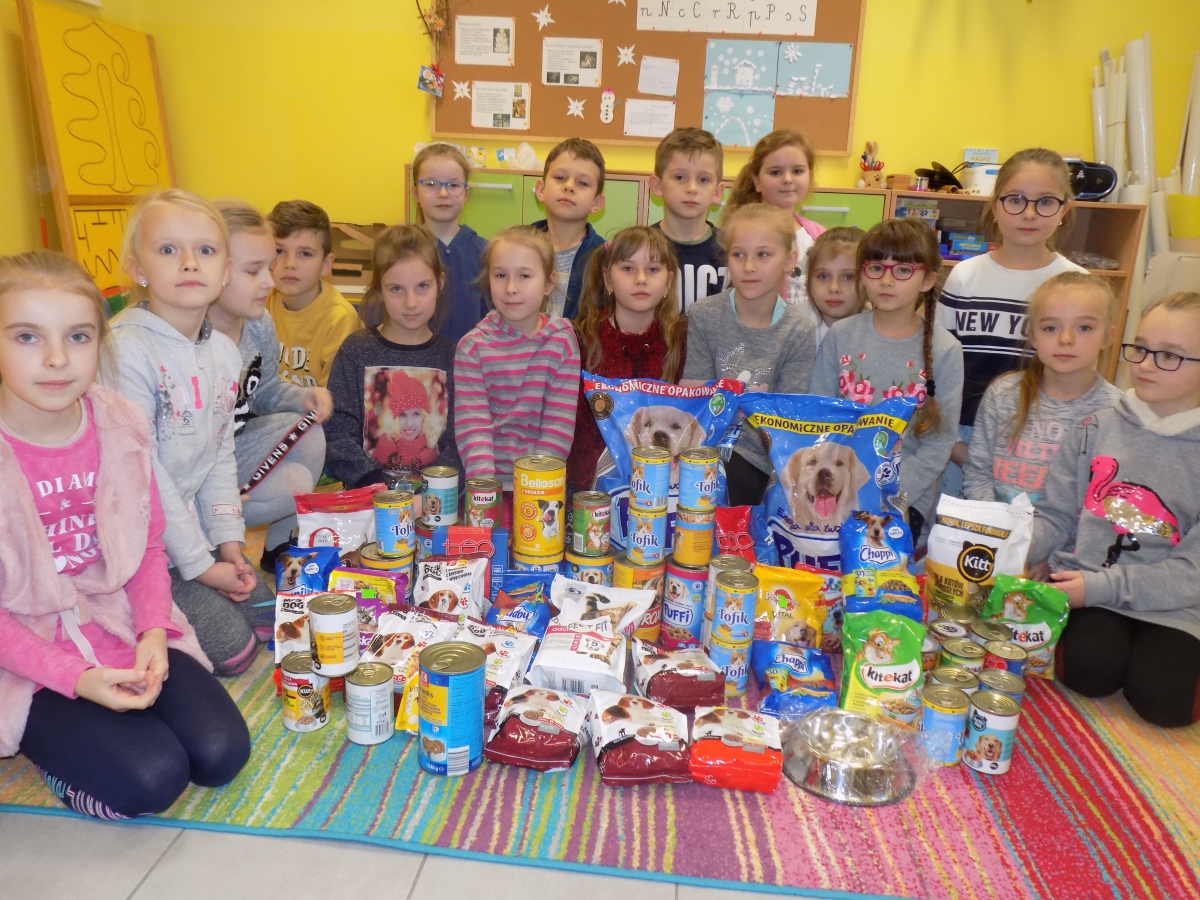 Dzięki ogromnemu zaangażowaniu dzieci przedszkolnych, uczniów z klas I-III i nauczycieli udało się zebrać 71.5 kg suchej i mokrej karmy oraz 1 miskę dla psów i kotów z Fundacji PSYstań